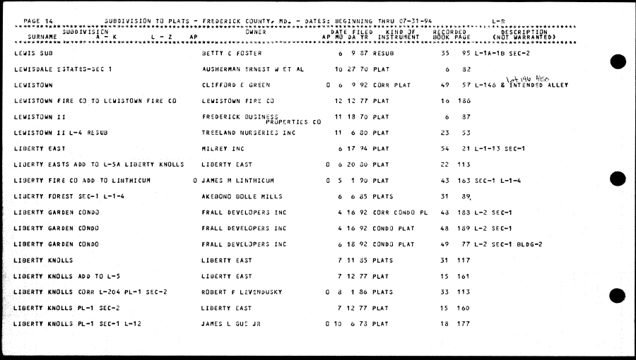 | LEWIS SU8 BETTY C FOSTER 6 9 87 RESU8 35 95 L-1A-1B SEC-2 LEWIS0ALE ESTATES-SEC 1 AUSHERHAN ERNEST U ET At 10 27 70 PLAT 6 82 \A\%? *\Sf> LEyiSTOHN CLIFFORD E GREEN 0 6 9 92 CORR PLAT 49 57 L-146 I INTENDED ALLEY L£yiSTQ«N FIRE CO TO LEyiSTOWN FIRE CO LEWI3TOWN FIRE CO 12 12 77 PLAT 16 186 LEWISTOyN II FREDERICK BUSINESS 11 13 70 PLAT 6 37 PROPERTIES CO LEyiSTOWN II L-4 HE3UB TREELAND NURSERIES INC 11 6 SO PLAT 23 53 LIBERTY EAST MILREY INC 6 17 94 PLAT 54 21 L-1-13 SEC-1 LIOERTY EASTS ADD TO L-5A LIBERTY KNOLLS LIBERTY EAST 0 6 20 30 PLAT 22 113 LI9ERTY FIRi CO ADD TO UNTHICUH 0 JAMES M LINTHICUM 0 5 1 90 PLAT 43 163 SEC-1 L-1 -4 LiaERTY FOREST SEC-1 L-1-4 AKE80NO BOLLE MILLS 6 6 85 PLATS 31 39, LIBERTY GARDEN CONDO FRALL DEVELOPERS INC 4 16 92 CORR CONDO PL 43 183 L-2 SEC-1 LIBERTY GARDEN CONDO FRALL DEVELOPERS INC 4 16 92 CONDO PLAT 48 189 L-2 SEC-1 LIBERTY GARDEN CONDO FRALL DEVELOPERS INC 6 18 92 CONDO PLAT 49 77 L-2 SEC-1 BLDG-2 LIBERTY KNOLLS LIBERTY EAST 7 11 35 PLATS 31 117 tISEKtY KNOLLS ADO TO L-5 LIBERTY EAST 7 12 77 PLAT 15 161 .-.LIBERTY KNOltS CORR L-204 PL-1 SEC-2 ROBERT F L£V£NDUSKY 0 a 1 86 PLATS 33 113 LISERTY KNOLLS PL-1 SEC-2 LIBERTY EAST 7 12 77 PLAT 15 160 LIBERTY KNOLLS PL-1 SEC-1 L-12 JAMES L GUE JR 0 10 6 73 PLAT 18 177 |