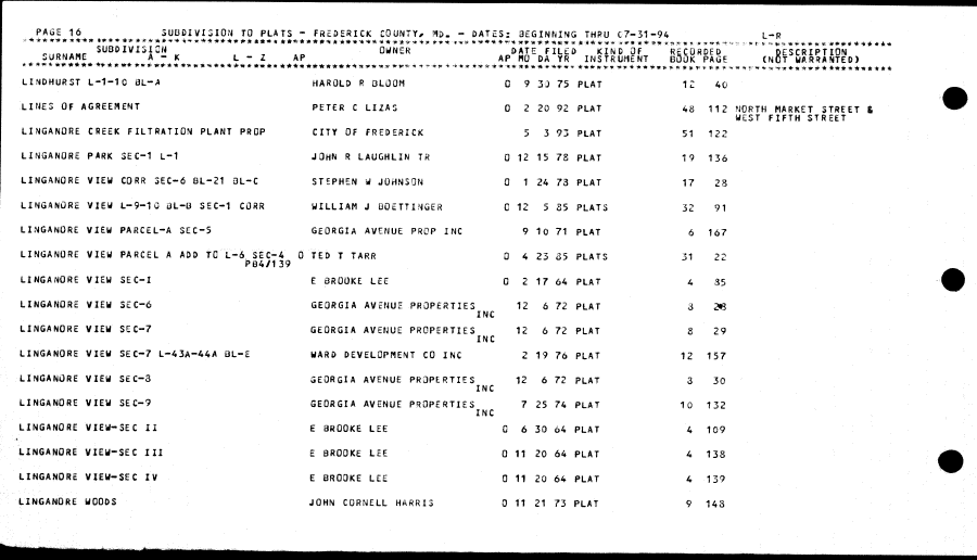 | LINOHURST L-1-1C BL-A HAROLD R 3LOOM 0 9 30 75 PLAT 12 40 LIMES OF AGREEMENT PETER C LIZAS 0 2 20 92 PLAT 48 112 NORTH MARKET STREET & WEST FIFTH STREET LINGANQRE CHEEK FILTRATION PLANT PROP CITY OF FREDERICK 5 3 93 PLAT 51 122 LINGANORE PARK SEC-1 L-1 JOHN R LAUGHLIN TR 0 12 15 78 PLAT 19 136 LINGANQRE VIEW CORR 3EC-6 8L-21 3L-C STEPHEN W JOHNSON 0 1 24 73 PLAT 17 28 LINGANQRc VIEW L-9-10 BL-B SEC-1 CORR WILLIAH J BOETTINGER C 12 5 35 PLATS 32 91 LINGANORE VIEW PARCEL-A SEC-5 GEORGIA AVENUE PROP INC 9 10 71 PLAT 6 167 LINGANORE VIEW PARCEL A ADD TO L-6 SEC-4 0 TED T TARR 0 4 23 S5 PLATS 31 22 P84/139 LINGANORE VIEW SEC-I £ BROOKE LEE o 2 17 64 PLAT 4 as LINGANOSE VIEW StC-6 GEORGIA AVENUE PROPERTIES 12 6 72 PLAT 3 2«8 INC LINGANORE VIEW SEC-7 GEORGIA AVENUE PROPERTIES 12 6 72 PLAT B 29 INC LINGANORE VIEW SEC-7 L-43A-44A BL-E WARD DEVELOPMENT CO INC 2 19 76 PLAT 12 157 LINGANORE VIEW SEC-3 GEORGIA AVENUE PROPERTIES 12 6 72 PLAT 3 30 INC LINGANORE VIEW SEC-9 GEORGIA AVENUE PROPERTIES 7 25 74 PLAT 10 132 INC LINGANORE VIEW-SEC II E SROOKE LEE C 6 30 64 PLAT 4 109 LINGANORE VIEW-SEC III £ SROOKE L£E 0 11 20 64 PLAT 4 138 LINGANORE VIEW-SEC IV E BROOKE LEE 0 11 20 64 PLAT 4 139 LINGANORE WOODS JOHN CORNELL HARRIS 0 11 21 73 PLAT 9 148 |