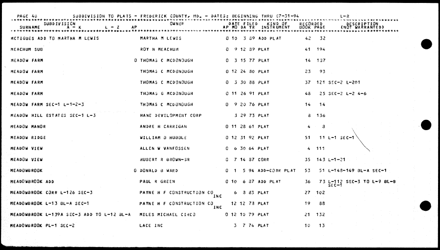 | MCTiGUcS ADD TO MARTHA M LEWIS MARTHA M LEWIS Q 10 3 S9 ADO PLAT 42 32 MEACHUM SUB ROY N MEACHUM 0 9 12 39 PLAT 41 194 MEADOW FARM 0 THOMAS C HCDONQUGH Q 3 15 77 PLAT 14 137 MEADOW FARM THOMAS C MCDQNQUGH 0 12 24 80 PLAT 23 93 MEADOW FARM THOMAS C MCOONOUGH 0 3 30 88 PLAT 37 121 SEC-2 L-201 MEADOW FARM THOMAS G MCDQNflUGH 0 11 26 91 PLAT 48 25 SEC-2 L-2 4-6 MEADOW FARM SEC-1 L-1-2-3 THOMAS C MCDONOUGH 0 9 20 76 PLAT 14 14 MEADOW HILL ESTATES SEC-1 L-3 HANt DEVELOPMENT CORP 3 29 73 PLAT 8 136 MEADOW MANOR ANDRE H CARRIGAN 0 11 28 61 PLAT 4 3 MEADOW RIDGE WILLIAM 3 HU83LE 0 12 31 92 PLAT 51 11 L-1 SEC-1 \ MEADOW VIEW ALLEN W VANFOSSEN 0 6 30 64 PLAT 4 111 \ MEADOW VIEW HUBERT R 8ROWN-SR Q 7 14 87 CQRR 35 143 L-1-21 MEAOOWBROOK 0 DONALD 8 WARD 0 1 5 94 ADD-CORR PLAT 53 51 L-148-149 3L-A SEC-1 MEAOOW8ROOK ADD PAUL R GREEN 0 10 6 37 ADD PLAT 36 73 L-112 SEC-3 TO L-9 8L-8 SEC-1 MEAOOwaROOK CORR L-126 3EC-3 PAYNE H f CONSTRUCTION CO 6 3 33 PLAT 27 102 INC MEADOWBROOK L-13 OL-A SEC-1 PAYNE H F CONSTRUCTION CO 12 12 73 PLAT 19 88 INC MEAOOW8ROOK L-139A SSC-3 ADD TO L-12 BL-A MILES MICHAEL CIRCO 0 12 10 79 PLAT 21 132 MEADOWB800IC PL-1 SEC-2 LACE INC 3 7 74 PLAT 10 13 |