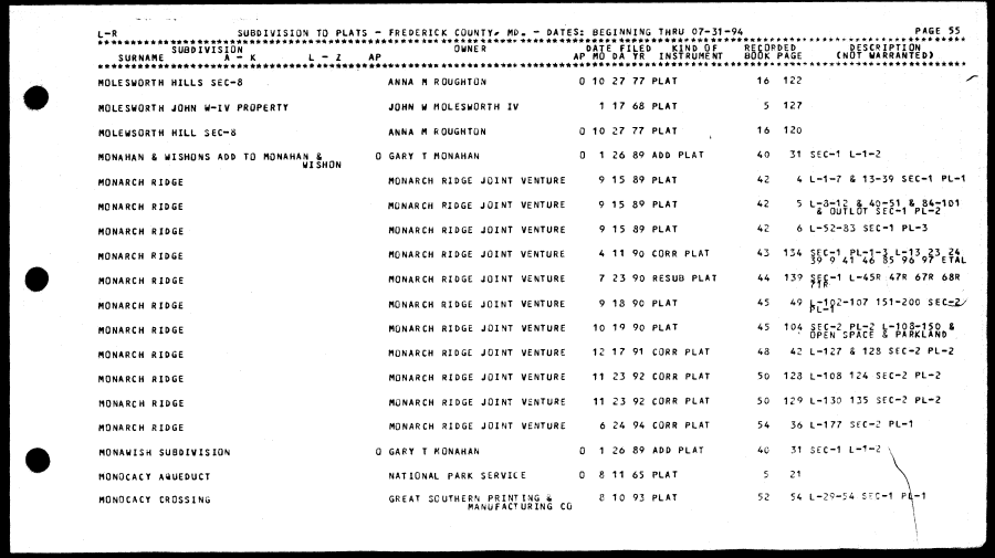 | MQLESHORTH HILLS SEC-8 ANNA ft RQUGHTON 0 10 27 77 PLAT 16 122 >" MOLESWQRTH JOHN W-IV PROPERTY JOHN W MQLESWQRTH IV 1 17 68 PLAT 5 127 MQLEWSORTH HILL SEC-S ANNA M RQUGHTQN Q 10 27 77 PLAT 16 120 i, MONAHAN & MISHONS AOO TO MQNAHAN & 0 GARY T MONAHAN 0 1 26 89 ADO PLAT 40 31 SEC-1 L-1-2 WISHON MONARCH RIDGE MONARCH RIDGE JOINT VENTURE 9 1 5 89 PLAT 42 4 L-1-7 & 13-39 SEC-1 PL-1 MONARCH RIDGE MONARCH RIDGE JOINT VENTURE 9 15 89 PLAT 42 5 L-8-1 2 I 40-51 & 84-101 MONARCH RIDGE MONARCH RIDGE JOINT VENTURE 9 15 89 PLAT 42 6 L-52-83 3EC-1 PL-3 MONARCH RIDGE MONARCH RIDGE JOINT VENTURE 4 11 9o CORR PLAT 43 134 SEC-I PL-1-3 L-13 23 24 39 9 41 46 85 96 97 ETAL MONARCH RIDGE MONARCH RIOGE JOINT VENTURE 7 23 90 RESUB PLAT 44 139 §|£-1 L-45R 47R 67R 68R MONARCH RIDGE MONARCH RIOGE JOINT VENTURE 9 13 90 PLAT 45 49 Lr"2&2-107 151-200 SECrZ/ MONARCH RIDGE MONARCH RIDGE JOINT VENTURE 10 19 90 PLAT 45 104 SEC-2 PL-2 L-108-150 & ' OPEN SPACE & PARKLAND MONARCH RIDGE MONARCH RIDGE JOINT VENTURE 12 17 91 CORR PLAT 48 42 L-127 & 128 SEC-2 PL-2 MONARCH RIDGE MONARCH RIDGE JOINT VENTURE 11 23 92 CORR PLAT 50 123 L-108 124 S6C-2 PL-2 MONARCH RIDGE MONARCH RIDGE JOINT VENTURE 11 23 92 CORR PLAT 50 129 L-130 135 SEC-2 PL-2 MONARCH RIDGE MONARCH RIDGE JOINT VENTURE 6 24 94 CORR PLAT 54 36 L-177 SEC-2 PL-1 MONAyiSH SUBDIVISION 0 GARY T KQNAHAN 0 1 26 89 ADD PLAT 40 31 SEC-1 L-1-2 \ MONOCACY AaUEDUCT NATIONAL PARK SERVICE 0 8 11 65 PLAT 5 21 \ MONOCACY CROSSING GREAT SOUTHERN PRINTING « 8 10 93 PLAT 52 54 L-29-54 SEC-1 Pt-1 MANUFACTURING CO \ \ |