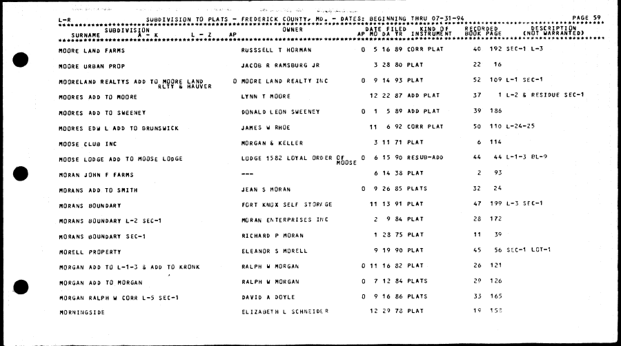 | MOORE LAND FARMS RUSSSELL T HQRMAN 0 5 16 89 CORR PLAT 40 192 SSC-1 L-3 MOORE URBAN PROP JACOB R RAMSBURG JR 3 28 80 PLAT 22 16 MQORELAND REALTYS ADD TO MOORE LAND 0 MOORE LAND REALTY INC 0 9 14 93 PLAT 52 109 L-1 SEC-1 RLTY it HAUVER MOQRES AOO TO MOORE LYNN T MOORE 12 22 87 ADD PLAT 37 1 L-2 i RESIDUE SEC-1 MOORES ADD TO SHEENEY DONALD LEON SyEENEY 0 1 5 89 ADD PLAT 39 186 MOORES ED« L ADD TO BRUNSWICK JAMES W RHOE 11 6 92 CORR PLAT 50 110 L-24-25 MOOSE CLU8 INC MORGAN & KELLER 3 11 71 PLAT 6 114 MOOSE LODGE ADD TO MOOSE LODGE LODGE 1582 LOYAL ORDER OF 0 6 15 90 RESUB-ADD 44 44 L-1-3 BL-9 MOOSE MORAN JOHN f FARMS —— 6 14 38 PLAT 2 93 MORANS ADD TO SMITH JEAN S MORAN 0 9 26 85 PLATS 32 24 MORANS BOUNDARY FORT KNOX SELF STORAGE 11 13 91 PLAT 47 199 L-3 SCC-1 MORANS BOUNDARY L-2 SEC-1 MORAN ENTERPRISES INC 2 9 84 PLAT 28 172 MORANS BOUNDARY SEC-1 RICHARD P MORAN 1 28 75 PLAT 11 39 MORELL PROPERTY ELEANOR S MORELL 9 19 90 PLAT 45 56 SEC-1 LOT-1 MORGAN ADD TO L-1-3 g ADD TO KRONK RALPH W MORGAN 0 11 16 82 PLAT 26 121 t MORGAN ADD TO MORGAN RALPH W MORGAN 0 7 12 84 PLATS 29 126 MORGAN RALPH U CORR L-5 SEC-1 DAVID A DOYLE 0 9 16 86 PLATS 33 165 MORNIHGSIDE ELIZABETH L SCHNEIOIR 12 29 78 PLAT 19 153 |