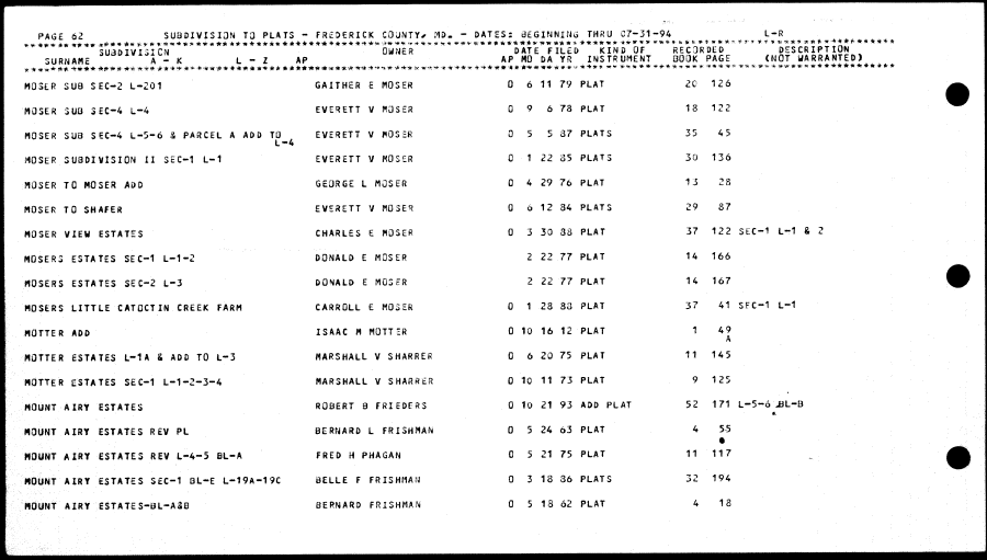 | MOSfcR SUB SEC-2 L-2Q1 GAITHER E MOSER 0 6 11 79 PLAT 20 126 H03ER SUB 3EC-4 L-4 EVERETT V WOSER 0 9 6 78 PLAT 18 122 MOSER SUB SEO4 L-5-6 3 PARCEL A ADD TO EVERETT V HOSER 0 5 5 87 PLATS 35 45 L-4 MOSER SUBDIVISION II SEC-1 L-1 EVERETT V MOSER 0 1 22 35 PLATS 30 136 PIQSER TO HOSER ADD GEORGE L MQSER 0 4 29 76 PLAT 13 28 MOSER TO SHAFER EVSRETT V NOSER 0 6 12 84 PLATS 29 87 HOSER VIEW ESTATES CHARLES £ MOSER 0 3 30 88 PLAT 37 122 StC-1 L-1 & 2 MOSESS ESTATES SEC-1 L-1-2 DONALD E MOSER 2 22 77 PLAT 14 166 MOSERS ESTATES SEC-2 L-3 DONALD E HQSER 2 22 77 PLAT 14 167 MQSERS LITTLE CATOCTIN CREEK FARM CARROLL E KOSER 0 1 23 83 PLAT 37 41 SFC-1 L-1 HOTTER ADD ISAAC « HOTTER 0 10 16 12 PLAT 1 49 A HOTTER ESTATES L-1A I ADO TO L-3 HARSHALL V SHARRER 0 6 20 75 PLAT 11 145 HOTTER ESTATES SEC-1 L-1-2-3-4 MARSHALL V SHARRER 0 10 11 73 PLAT 9 125 MOUNT AIRY ESTATES ROBERT 9 FRIEDER3 0 10 21 93 ADD PLAT 52 171 L-5-6 JSL-Q *. MOUNT AIRY ESTATES REV PL BERNARD L FRISHMAN 0 5 24 63 PLAT 4 55 * MOUNT AIRY ESTATES REV L-4-5 BL-A FRED H PHAGAN 0 5 21 75 PLAT 11 117 S0UNT AIRY ESTATES SEC-1 BL-E L-19A-19C BELLE F FRISHflAM 0 3 18 86 PLATS 32 194 MOUNT AIRY SSTATES-BL-AiB BERNARD FRiSHMAN 0 5 18 62 PLAT 4 18 |