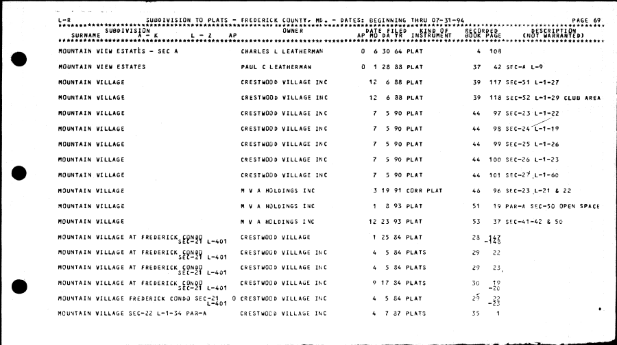 | MOUNTAIN VIEW ESTATES - SEC A CHARLES L LEATHERMAN 0 6 30 64 PLAT 4 108 MOUNTAIN VIEW ESTATES PAUL C LEATHERMAN 0 1 28 S3 PLAT 37 42 SEC-A L-9 MOUNTAIN VILLAGE CRESTWOOD VILLAGE INC 12 6 88 PLAT 39 117 SEC-51 L-1-27 MOUNTAIN VILLAGE CRESTWOOD VILLAGE INC 12 6 88 PLAT 39 118 SEC-52 L-1-29 CLUB AREA MOUNTAIN VILLAGE CRESTWOOO VILLAGE INC 7 5 90 PLAT 44 97 SEC-23 L-1-22 >-"'* MOUNTAIN VILLAGE CRESTWOOD VILLAGE INC 7 .5 90 PLAT 44 98 SEC-24'1-1-19 MOUNTAIN VILLAGE CRESTWOOD VILLAGE INC 7 5 90 PLAT 44 99 S€C-25 L-1-26 MOUNTAIN VILLAGE CRESTWOOO VILLAGE INC 7 5 90 PLAT 44 100 SEC-26 L-1-23 MOUNTAIN VILLAGE CRESTyOOD VILLAGE INC 7 5 90 PLAT 44 1C1 SEC-2? ,L-1-60 MOUNTAIN VILLAGE M V A HOLDINGS INC 3 19 91 CORR PLAT 46 96 SFC-23 ,L-?1 i 22 MOUNTAIN VILLAGE M V A HOLDINGS INC 1 8 93 PLAT 51 19 PAR-A SEC-5Q OPEN SPACE MOUNTAIN VILLAGE M V A HOLDINGS INC 12 23 93 PLAT 53 37 SEC-41-42 3, 50 MOUNTAIN VILLAGE AT FREDERICK CPRO ,. CRESTWOOD VILLAGE 1 25 84 PLAT 23 _147 MOUNTAIN VILLAGE AT FREDERICK CONDQ CRESTWOOD VILLAGE INC 4 5 84 PLATS 29 22 SEC-21 L-401 MOUNTAIN VILLAGE AT FREDERICK CONOO CRESTWOOD VILLAGE INC 4 5 84 PLATS 29 23 SEC-21 L-401 MOUNTAIN VILLAGE AT FREDERICK CONOO CRESTWQOO VILLAGE INC 9 17 34 PLATS 30 19 SEC-21 L-401 -20 MOUNTAIN VILLAGE FREDERICK CONDO SEC-21 0 CRESTWOOD VILLAGE INC 4 5 84 PLAT 29 22 L-401 -23 MOUNTAIN VILLAGE SEC-22 L-1-34 PAR-A CRESTWQCD VILLAGE INC 4 7 37 PLATS 35 1 |