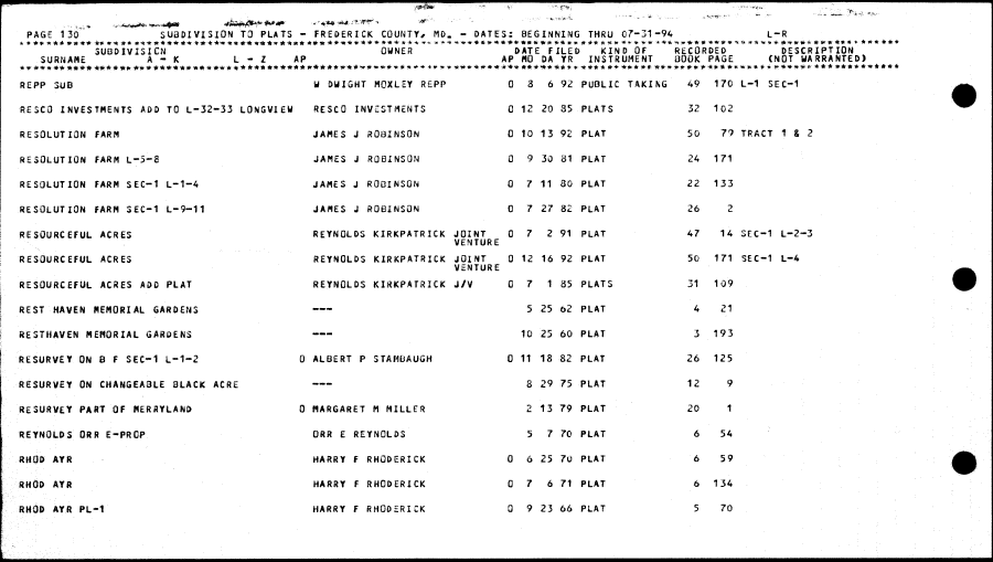 | REPP SUB W SLIGHT MOXLEY REPP 0 3 6 92 PUBLIC TAKING 49 170 L-1 SEC-1 RESCO INVESTMENTS ADO TO L-32-33 LONGVIEW RESCO INVESTMENTS 0 12 20 35 PLATS 32 102 RESOLUTION FARM JAMES J ROBINSON 0 10 13 92 PLAT 50 79 TRACT 1 & 2 RESOLUTION FARM L-5-8 JAMES J ROBINSON 0 9 30 81 PLAT 24 171 RESOLUTION FARM SEC-1 L-1-4 JAMES J ROBINSON 0 7 11 80 PLAT 22 133 RESOLUTION FARM SEC-1 L-9-11 JAMES J ROBINSON 0 7 27 82 PLAT 26 2 RESOURCEFUL ACRES REYNOLDS KIRKPATRICK JOINT Q 7 2 91 PLAT 47 14 SEC-1 L-2-3 VENTURE RESOURCEFUL ACRES REYNOLDS KIRKPATRICK JOINT 0 12 16 92 PLAT 50 171 SEC-1 L-4 VENTURE RESOURCEFUL ACRES ADO PLAT REYNOLDS KIRKPATRICK J/V 0 7 1 85 PLATS 31 109 REST HAVEN MEMORIAL GARDENS —— 5 25 62 PLAT 4 21 RESTHAVEN MEMORIAL GARDENS —— 10 25 60 PLAT 3 193 RESURVEY ON 8 f SEC-1 L-1-2 0 ALBERT P STAHOAUGH 0 11 18 82 PLAT 26 125 R6SURVEY ON CHANGEABLE SLACK ACRE —— 8 29 75 PLAT 12 9 8£SURV£Y PA«T OF HERSYLAND 0 MARGARET M MILLER 2 13 79 PLAT 20 1 REYNOLDS OR8 E-PROP ORR £ REYNOLDS 5 7 70 PLAT 6 54 SHOD AYR HARRY F RHODERICK 0 6 25 70 PLAT 6 59 RHOD AYR HARRY F RHODERICK 0 7 6 71 PLAT 6 134 RH00 AYR PL-1 HARRY F RHODERICK Q 9 23 66 PLAT 5 70 |