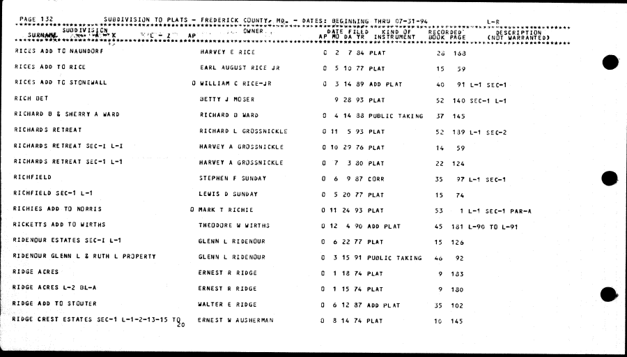| RICES ADD TO NAUNDORF HARVEY E RICE 0 2 7 84 PLAT 2d 163 RICES ADO TO RICE EARL AUGUST RICE JR 0 5 10 77 PLAT 15 59 RICES ADO TC STONEWALL 0 WILLIAM C RICE-JR 0 3 U 89 ADO PLAT 40 91 L-1 SEC-1 RICH BET BETTY J MOSER 9 28 93 PLAT 52 140 SEC-1 L-1 RICHARD 8 £ SHERRY A WARD RICHARD 0 WARD 0 4 14 33 PUBLIC TAKING 37 145 RICHARDS RETREAT RICHARD L 6ROSSNICKLE 0 11 5 93 PLAT 52 139 L-1 SEC-2 RICHARDS RETREAT SEC-I L-I HARVEY A GROS3NICKLE 0 10 29 76 PLAT 14 59 RICHARDS RETREAT SEC-1 L-1 HARVEY A GROSSNICKLE 0 7 3 30 PLAT 22 124 RICHFIELD STEPHEN F SUNDAY 0 6 9 87 CORR 35 97 L-1 SEC-1 RICHFIELD SEC-1 L-1 LEWIS D SUNDAY 0 5 20 77 PLAT 15 74 RICHIES ADO TO NORRIS 0 MARK T RICHIE 0 11 24 93 PLAT 53 1 L-1 SEC-1 PAR-A 8ICKETTS ADD TO WIRTHS THEODORE W WIRTH3 0 12 4 90 ADD PLAT 45 181 L-90 TO L-91 RIDEMOUR ESTATES SEC-I L-1 GLENN L RIDENOUR 0 6 22 77 PLAT 15 126 RlDEttOUR GLfiNN L 2 RUTH L PROPERTY GLENN L RIDENOUR 0 3 15 91 PUBLIC TAKING 46 92 RIOQE ACRES ERNEST R RIDGE 0 1 18 74 PLAT 9 133 RIDGE ACRES L-2 BL-A ERNEST R RIDGE 0 1 15 74 PLAT 9 130 RIDGE ADD TO STOUTER WALTER £ RIDGE 0 6 12 37 ADD PLAT 35 102 RIDGE CREST ESTATES SEC-1 L-1-2-13-15 TO ERNEST W AUSHERNAN 0 3 14 74 PLAT 10 145 ZO |