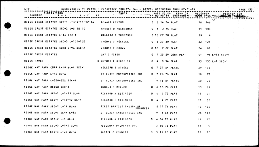 | >4., ». RIDGE CREST ESTATES SEC-1 L-3-4-11-12-14 DONALD LINTON 0 8 14 74 PLAT 10 146 RIDGE CREST ESTATES SEC-2 L-5 TO 10 ERNEST W AUSHERMAN 0 5 2 75 PLAT 11 103 RIDGE CREST ESTATES L-16 SEC-1 WILLIAM E THOMPSON 0 10 27 78 PLAT 19 4 RIDGE CREST ESTATES SEC-3 L-101-102 THOMAS 6 ROETZEL 0 6 27 80 PLAT 22 121 RIDGE CREST ESTATES CORR L-9A SEC-2 JEROME R BROWN 0 10 7 82 PLAT 26 82 RIDGE CREST ESTATES JAY S FIFER 0 7 25 89 CORR PLAT 41 96 L-15 SEC-1 RIDGE HAVEN 0 LUTHER T RIDGE-SR 0 4 8 94 PLAT 53 153 L-1 SEC-1 RIDGE HAY FARM CORR L-10 BL-A StC-1 WILLIAM T ATWELL 0 7 31 84 PLATS 29 156 RIDGE WAY FARM L-16 8L-A ST CLAIR ENTERPRISES INC 0 7 26 73 PLAT 13 72 RIDGE WAY FARM L-320-322 SEC-4 ST CLAIR ENTERPRISES INC 9 18 84 PLATS 30 24 RIDGE WAY FARM RESU8 SEC-3 DONALD 0 MILLER 0 6 13 76 PLAT 13 89 RIDGE WAY FARM SEC-1 L-1-15 8L-A RICHARD H EISINGER 0 4 4 75 PLAT 11 79 RIDGE WAY FARM SEC-1 L-16-17 BL-A RICHARD H EISINGER 0 4 4 75 PLAT 11 SO RIDGE WAY FARM SEC-1 L-1A 8L-A FIRST BAPTIST CHURCH QF 8 19 76 PLAT 13 134 nuNKUV X A RIDGE WAY FARM SEC-1 BL-A L-18 ST CLAIR ENTERPRISES INC 9 1 81 PLAT 24 143 RIDGE WAY FARM SEC-2 L-1 8L-A RICHARD H EISINGER 0 4 24 75 PLAT 11 97 RIDGE WAY FARM SEC-3 L-1-2 BL-A RIDGEWAY PROPERTY INC 3 30 76 PLAT 13 5 RIDGE WAY FARM SEC-3 L-28 BL-A DANIEL C CONNERS 0315 73 PLAT 17 77 |