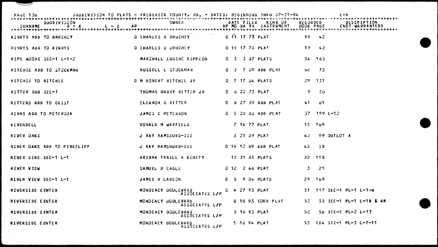 | RINDTS ADO TO 8RUCHEY 0 CHARLES D SRUCHEY 0 1*1 17 7*8 PLAT 19 42 RINDTS ADD TO RINDTS 0 CHARLES 0 BRUCHEY 0 11 17 73 PLAT 19 42 RIPS yOQOS SEC-1 L-1-2 MARSHALL EUGENE R1PPEOM Q 3 3 37 PLATS 34 165 RITCHIE ADD TO STOCKWAft RUSSELL L STOCKMAN Q 3 7 39 ADD PLAT 40 73 RITCHIE TO RITCHIE 0 M ROBERT RITCHIE JR Q 7 17 &4 PLATS 29 131 RITTER SU8 SEC-1 THOMAS HAR«Y RITTER JR 0 6 22 73 PLAT 9 20 RITTERS ADD TO CRI3T ELEANOR G RITTER Q 6 27 39 ADD PLAT 41 61 R1VAS ADD TO PETERSQfi JAMES £ PETERSON Q 5 20 33 ADD PLAT 37 199 L-12 RIVENDELL DONALD M WARFIELD 7 14 77 PLAT 15 1b9 RIVER OAKS J RAY RANS3URG-III 3 21 39 PLAT 40 99 OUTLOT A RIVER OAKS ADD TO PINECLIFF J RAY RAHSBURG-III 0 10 12 89 ADD PLAT 42 33 RIVER SIDE SEC-1 L-1 ARIANA TRAILL A KtNETY 12 31 85 PLATS 32 118 «IV£R VIEy SAMUEL 3 EAGLE 0 12 2 46 PLAT 3 21 RIVER VIEW SEC-1 L-1 JAMES H LADS3N 0 8 9 34 PLATS 29 169 RIVERSIDE CENTER M0NQCACY BOULEVARD Q 4 27 93 PLAT 51 117 SEC-1 PL-1 L-1-6 ASSOCIATES L/P RIVERSIDE CENTER MONOCACY BOULEVARD 8 10 93 CORR PLAT 52 55 3EC-1 PL-1 L-1R J 4R ASSOCIATES L/P RIVERSIDE CENTER MQNQCACY BOULEVARD 8 10 93 PLAT 52 56 S6C-1 PL-2 L-13 ASSOCIATES L/P RIVERSIDE CENTER HONOCACY OOULEVARD 5 10 94 PLAT 53 184 SEC-1 PL-3 L-7-11 ASSOCIATES L/P |