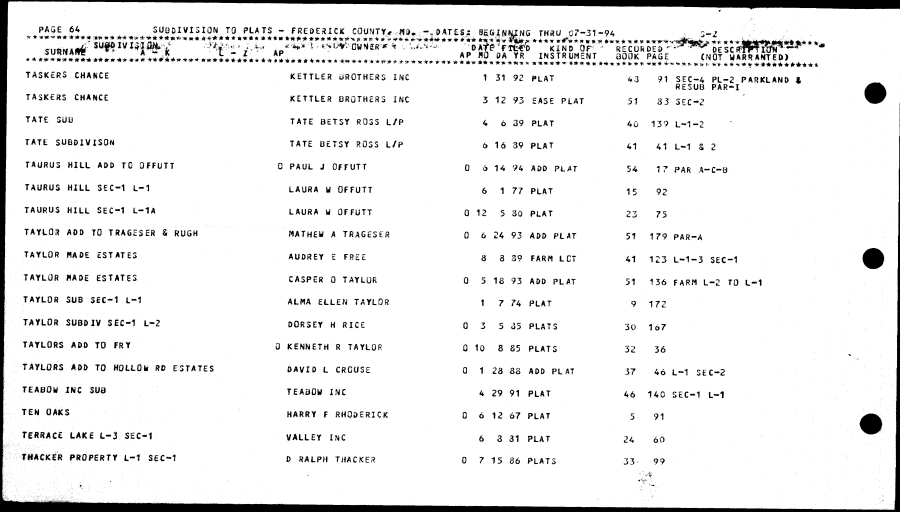 | » * *#•* *•****•* ******* *** •**».»» *>*»•**» »»»***i»#»* •»*»*»*»*•#»»*•* * •*«*-*•* *»-****#***** + ++ to************ * + ****+*#** ******+*+**+***» *»t'. *+ *»*w*+1liw**mwm*1i1i TASKtRS CHANCE KETTLER BROTHERS INC 1 31 92 PLAT 43 91 SEC-4 PL-2 PARKLAND £ RESU8 PAR-I TASKERS CHANCE KETTLER BROTHERS INC 3 12 93 EASE PLAT 51 33 S-EC-2 TATE SUB TATE BETSY ROSS L/P 4 6 39 PLAT 40 139 L-1-2 TATE SUBDIVISQN TATE BETSY RQSS L/P 6 16 89 PLAT 41 41 L-1 & 2 TAURUS HILL ADO TO QFFUTT 0 PAUL J OFFUTT 0 6 14 94 ADO PLAT 54 17 PAR A-C-8 TAURUS HILL SEC-1 L-1 LAURA W OFFUTT 6 1 77 PLAT 15 92 TAURUS HILL SEC-1 L-1A LAURA W OFFUTT 0 12 5 30 PLAT 23 75 TAYL03 ADD TO TRAGESER S RUGH MATHEW A TftAGESER 0 6 24 93 ADO PLAT 51 179 PAR-A TAYLOR «ASE ESTATES AUDREY E FREE 8 8 89 FARM LOT 41 123 L-1-3 sec-1 TAYLQR MADE ESTATES CASPER 0 TAYLOR 0 5 1S 93 ADO PLAT 51 136 FARM L-2 TO L-1 TAYLOR SUB SEC-1 L-1 ALMA ELLEW TAYLOR 1 7 74 PLAT 9 172 TAYLOR SUED IV SEC-1 L-2 DORSEY H RICE 0 3 5 35 PLATS 30 167 TAYLORS ADD TO FRY 0 KENNETH R TAYLOR 0 10 8 85 PLATS 32 36 TAYLORS ADD TO HOLLOW J?0 ESTATES 0AVIO L CRCUSE 0 1 28 38 ADO PLAT 37 46 L-1 SEC-2 TEA80W JNC SU8 TEABOW INC 4 29 91 PLAT 46 140 SEC-1 L-1 TEN OAKS HARRY F RHOOERICK 0 6 12 67 PLAT 5 91 TERHAC£ LAK£ L-3 SEC-1 VALLEY INC 6 3 31 PLAT 24 60 fHACKER PROPERTY L-t SEC-1 D RALPH THACKER 0 7 15 86 PLATS 33 99 "* *''^. « -^ , '' "* «; |