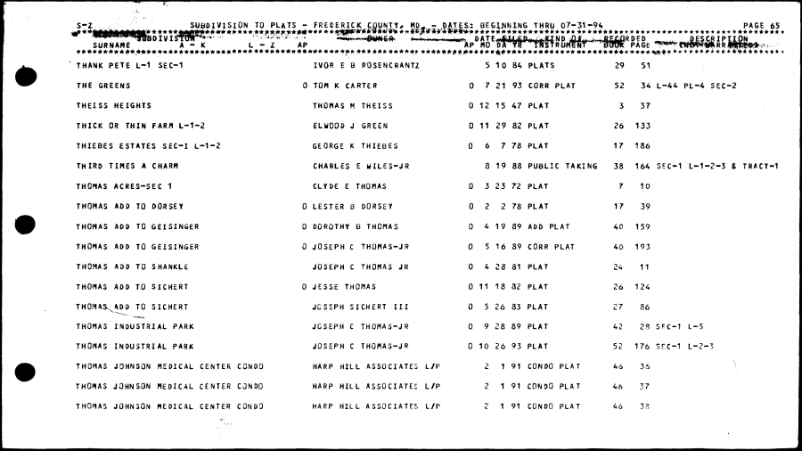 | ' THANK PETE L-1 SEC-1 IVOR E 8 RQSENCRANTZ 5 10 84 PLATS 29 51 THf GREENS 0 TOM K CARTER 0 7 21 93 CORK PLAT 52 34 L-44 PL-4 SEC-2 THEISS HEIGHTS THOMAS W THEISS 0 12 15 47 PLAT 3 37 THICK OR THIN FARM L-1-2 ELWOOO J GREEN 0 11 29 82 PLAT 26 133 THIE8ES ESTATES SEC-I L-1-2 GEORGE K THIEBES 0 6 7 78 PLAT 17 186 THIRD TIMES A CHARM CHARLES £ WILES-JR a 19 88 PUBLIC TAKING 38 164 SEC-I L-1-2-3 & TRACT-I THOMAS ACRES-SEC 1 CLYDE E THOMAS 0 3 23 72 PLAT 7 10 THOMAS ADO TO DORSEY 0 LESTER 8 DORSET 0 2 2 78 PLAT 17 39 THOMAS ADD TO GEISINGER 0 DOROTHY 6 THOMAS 0 4 19 89 ADO PLAT 40 159 THOMAS ADD TO GEISINGER 0 JOSEPH C THQMAS-JR 0 5 16 89 CORR PLAT 40 193 THOMAS ADO TO SHANKLE JOSEPH C THOMAS JR 0 4 28 81 PLAT 24 11 THOMAS ADD TO SICHERT 0 JESSE THOMAS 0 11 18 32 PLAT 26 124 THOHAS^ADD TO SICHERT JOSEPH SICHERT III 0 5 26 83 PLAT 27 86 THOMAS INDUSTRIAL PARK JOSEPH C THOMAS-JR 0 9 28 89 PLAT 42 28 SFC-1 L-5 THOMAS INDUSTRIAL PARK JOSEPH C THOMAS-JR 0 10 26 93 PLAT 52 176 SEC-1 L-2-3 THOMAS JOHNSON MEDICAL CENTER CONDO HARP HILL ASSOCIATES L/P 2 1 91 CONDO PLAT 46 36 \ THOMAS JOHNSON MEDICAL CENTER CONDO HARP HILL ASSOCIATES L/P 2 1 91 CONDO PLAT 46 37 THOMAS JOHNSON MEDICAL CENTER CONDO HARP HILL ASSOCIATES L/P 2 1 91 CONDO PLAT 46 33 (*••" |