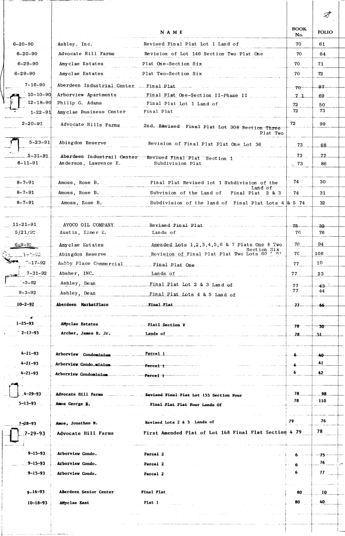 | 6-20-90 Ashley , Inc. Revised Final Plat Lot 1 Land of 70 61 6-20-90 Advocate Hill Farms Revision of Lot 146 Section Two Plat One 70 64 6-29-90 Amyclae Estates Plat One -Sect ion Six 70 71 6-29-90 Amyclae Estates Plat Two-Section Six 70 72 7-16-90 Aberdeen Industrial.. Center, Final -Plat 70 87 10-10-90 Arborview Apartments Final Plat One-Section II-Phase II 69 12-18-90 Philip G. Adams Final Plat Lot 1 Land of 72 50 1-22-91 Amyclae Business Center Final Plat 72 73 2-20-91 Advocate Hills Farms. 2n.d..,.Jl(bvised- Fin l- Plat Lot 3O8 Sect Ion- ThT e-Plat Two 72 99 5-23-91 Abingdon Reserve Revision of Final Plat Plat One Lot 36 73 68 5-31-91 Aberdeen In dust rai 1 -Center Revts d Final "Plat Section 1 73 77 6-11-91 Anderson, Lawrence E. Subdivision Plat 73 86 8-7-91 Amoss , Rose B. Final Plat Revised lot 1 Subdivision of the 74 30 8-7-91 Land of-Amoss, Rose B. Subvision of the Land of Final Plat 2 & 3 74 31 8-7-91 Amoss, Rose B. Subdivision of the land of Final Plat Lots 4 & 5 74 32 11-21-91 AVOCO OIL COMPANY Revised Final Plat 76 32 5/21/92 Austin, Elmer E. Lands of 76 76 6- ... .Amyclae.. Estates Amended. Lots 1,2,3 ,4 ,5,6 & 7 Plats Oae & Two. 76 94 Section Six Abingdon Reserve Revision of Final Plat Plat TTwo Lots 60 ° GI 7C 108 -17-92 Ashby Place Commercial Final Plat One 77 10 7-31-92 Absher, INC. Lands of 77 23 -3-92 Ashley, Dean Final P1 at Lot 2 & 3 Land of 77 49 9-3-92 Ashley, Dean Final Plat Lots 4 & 5 T,and of 77 44 3-92 Aberdeen Marketplace Final Plal- 77 66 1-25-93 AMyclae Estates PlatI Section V 78 30 2-17-93 Archer, James H. Jr. Lands of 78 51 4-21-93 Arborview Condoainlwa Parcel 1 6 40 4-21-93 Arborview Hondn. minium Parcel 1 6 41 4-21-93 Arborview Condominium Parcel 1 6 42 .4-29-93 Advocate Hill Farms Ravise4 Final PLat Lot 155 Section Four 78 98 5-13-93 AMIS George H. Final Plat Plat Four Lands Of 78 110 7-28-93 Aaos, Jonathan N. Revised Lots 2 & 3 Lands of 79 76 07-29-93 Advocate Hill Farms First Amended Plat of Lot 168 Final Plat Sectior 79 78 9-15-93 Arborview Condo. Parcel 2 6 75 9-15-93 Arborview Condo. Parcel 2 6 76 9-15-93 Arborview Condo. Parcel 2 6 77 9-16-93 ABerdeen Senior Center Final Plat 10 10-18-93 AMyclae East Plat 1 80 40 |