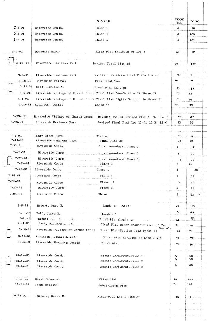 | -5-91 Riverside Con do. Phase 1 4 99 2-5-91 Riverside Con do. Phase 1 4 100 2-5-91 Riverside Con do. Phase 1 4 101 2-5-91 Rockdale Manor Final Plat REvision of Lot 3 72 79 2-26-91 Riverside Business Park Revised Final Plat 25 72 102 3-8-91 Riverside Business Park Partial Revision- Final Plats 8 & 29 73 1 3-18-9 Riverside Parkway Final Plat Two 73 7 3-28-9 L Reed, Harless M. Final PI tit Land of 73 19 4-1-91 Riverside Village of Chruch Creek Final PI "at One-Section IA Phase II 73 23 4-1-91 Riverside Village of Church Creek Final Plat Eight- Section I- Phase II 73 24 4-25-91 Robinson, Donald Lands of 73 39 5-23- 91 Riverside Village of Church Creek Revised lot 13 Revised Plat 1 Section 1 73 67 8-20-91 Riverside Business Park Revised Final Plat Lot 12-A, 12-B, 12-C 73 97 7-9-91 Rocky Ridge Farm Plat of . 74. 15.-. 7-11-91 Riverside Business Park Final Plat 30 74 20 7-22-91 Riverside Con do First Amendment Phase 2 . . . . . . t 5 34 7-22-91 Riverside Condo First Amendment Phase 2 .5 35 . 7-22-91 Riverside Condo First Amendment Phase 2 .5 36 7-25-91 Riverside Condo Phase 1 5 37 7-25-91 Riverside Condo Phase 1 5 38 7-25-91 Riverside Condo Phase i 5 39 7-25-91 Riverside Condo . phase 1 5 40 7-25-91 Riverside Condo Phase 1 5 41 7-25-91 Riverside Condo Phase 5 42 8-9-91 Robert, Mary E. Lands of Owner 74 34 8-16-91 Ruff, James H. Lands of 74 48 8-21-9 1 -'-.Rick-ey '., r. .j . .Final Plat il. i&nd of 74 4 9 9-21-91 Race, Richard L. Jr. Final Plat Minor Resubdivision of Two P 3.T T fi 74 . 70 . 9-18-91 Riverside Village of Chruch Creek Final Plat-Section IIIJ Phase II 74 .74. 0-18-91 Robinson, Edward & Wife Final Plat Revision of Lots 2 & 4 74 76 10-7-91 Riverside Shopping Center . .Final Plat 74 94 10-15-91 i Riverside Condo. Second AMendment -Phase 3 5 58 10-15-91 Riverside Condo. Second Amendment -Phase 3 5 59 10-15-91, Riverside Condo. Second Amendment -Phase 3 5 60 10-16-91 Royal Ret are at Final Plat 74 103 10-18-91 Ridge Heights Subdivision Plat 74 106 10-31-91 Russell, Harry E. Final Plat Lot 1 Land of 75 9 |