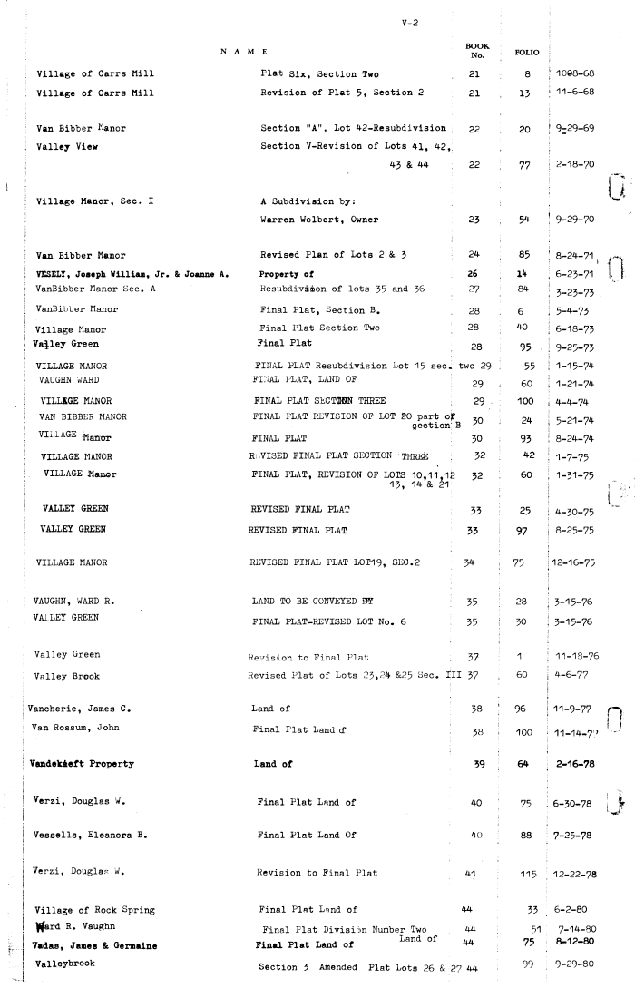 | Village of Carrs Mill Plat Six, Section Two 21 8 10Q8-68 Village of Carrs Mill Revision of Plat 5, Section 2 21 13 11-6-68 Van Bibber anor Section "A", Lot 42-Resubdivision 22 20 9z29-69 Valley View Section V-Revision of Lots 41, 42, 43 & 44 22 77 2-18-70 Village Manor, Sec. I A Subdivision by Warren Wolbert, Owner 23 9-29-70 Van Bibber Manor Revised Plan of Lots 2 & 3 24 85 8-24-71 VESELT, Joaeph William, Jr. & Joanne A Property of 26 l4 6-23-71 VanBibber Manor Sec. A Hesubdivsjbon of lots 35 and 36 27 84 3-23-73 VanBibber Manor Final Plat, Section B. 28 6 5-4-73 Village Manor Final Plat Section Two 28 40 6-18-73 Va ley Green Final Plat 28 95 9-25-73 VILLAGE MANOR FINAL PLAT Resubdivision Lot 15 sec.two 29 55 1-15-74 VAUGHN WARD FINAL PLAT, LAND OF 29 60 1-21-74 VILLSGE MANOR FINAL PLAT SECTOJBN THREE , 29 100 4 4 74 VAN BIBBEH MANOR FINAL PLAT REVISION OF LOT 20 part ojf section I 30 24 5-21-74 VILLAGE foaaor FINAL PLAT 30 93 8-24-74 VILLAGE MANOR Ri, VISED FINAL PLAT SECTION THRh 32 42 1-7-75 VILLAGE Manor FINAL PLAT, REVISION OF LOTS 10,11,1 13, 14 & 21 32 60 1-31-75 VALLET GREEN REVISED FINAL PLAT 33 25 4-30-75 VALLEY GREEN REVISED FINAL PLAT 33 97 8-25-75 VILLAGE MANOR REVISED FINAL PLAT LOT19, SEC. 2 3 75 12-16-75 VAUGHN, WARD R. LAND TO BE CONVEYED 31Y 35 28 3-15-76 VALLEY GREEN FINAL PLAT-REVISED LOT No. 6 35 30 3-15-76 Valley Green Revision to Final Plat 37 1 11-18-76 Valley Brook Revised Plat of Lots 23,24 &25 Sec. tl 37 60 4-6-77 Vancherie, James C. Land of 38 96 11-9-77 Van Rossum, John Final Plat Land tf 38 100 11-14-77 Vandek&eft Property Land of 39 64 2-16-78 Vcrzi, Douglas W. Final Plat Land of 40 75 6-30-78 Vessells, Eleanora B. Final Plat Land Of 4o 88 7-25-78 Verzi, Douglas W. Revision to Final Plat 41 115 12-22-78 Village of Rock Spring Final Pint Lnnd of 44 33 6-2-80 tfard R. Vaughn Final Plat Divisifim Number Two 44 51 7-14 80 Vadas, James & Germaine Final Plat Land of 44 75 8-12-80 Valleybrook Section 3 Amended Plat Lots 26 & 2 44 99 9-29-80 |