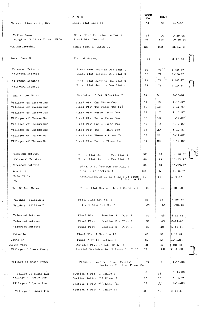 | Vecera, Vincent J. , Sr. Final Plat Land of 54 32 4-7-86 Valley Green Final Plat Revision to Lot 8 55 92 9-29-86 Vaughan, William X. and Wife Final Plat Land of 55 105 10-10-86 VCK Partnership Final Plat of Lands of 55 109 10-15-86 Voss, Jack B. Plat of Survey 57 9 2-18-87 Valewood Estates Final Plat Section One Plat" 1 58 71 6-19-87 Valewood Estates Final Plat Section One Plat 2 58 72 6-19-87 Valewood Estates Final Plat Section One Plat 3 58 73 6-19-87 Valewood Estates Final Plat Section One Plat 4 58 74 6-19-87 Van Bibber Manor Revision of Lot 2j Section B 59 5 7-30-87 Villages of Thomas Run Final Plat One-Phase One 59 15 8-12-87 Villages of Thomas Run Final Plat Two-Phase Txvo OA/t 59 16 8-12-87 Villages of Thomas Run Final Plat Three-Phase One 59 17 8-12-87 Villages of Thomas Run Final Plat Four- Phase One 59 18 8-12-87 Villages of Thomas Run Final Plat One - Phase Two 59 19 8-12-87 Villages of Thomas Run Final Plat Two - Phase Two 59 20 8-12-87 Villages of Thomas Run Final Plat Three - Phase Two 59 21 8-12-87 Villages of Thomas Run Final Plat Four - Phase Two 59 22 8-12-87 Valewood Estates ,-,. T-m o ± m T -I O Final Plat Section Two Plat 3 60 28 11-13-87 Valewood Estates Final Plat Section Two Pltat 2 60 29 11-13-87 Valewood Estates ,,. , ~.n , 0 , . ~n , -Final Plat Section Two Plat 1 60 30 11-13-87 Voshelle Final Plat Section 1 60 35 11-18-87 Vale Hills Resubdivision of Lots 12 & 13 Block B Section I1 60 53 L2-4-87 Van Bibber Manor Final Plat Revised Lot 3 Section B 61 81 3-23-88 Vaughan, William X. Final Plat Lot No. 3 62 25 4-28-88 Vaughan, William X. Final Plat Lot No. 2 62 26 4-28-88 Valewood Estates Final Plat Section 3 - Plat 1 62 45 5-17-88 Valewood Estates Final Plat Section 3 - Plat 2 62 46 5-17-88 Valewood Estates Final Plat Section 3 - Plat 3 62 47 5-17-88 Voshelle Final Plat I Section II 62 55 5-19-88 Voshelle Final Plat II Section II 62 55 5-19-88 Valley View Amended Plat of Lots 37 & 38 62 95 3-23-88 Village of Scots Fancy Partial Revision No. 1 Phase 1 ?t ?s 62 105 7-18-88 Village of Scots Fancy , Phase II Section II and Partial Revision No. 2 to PhaseOne 63 8 7-22-88 Village of Bynum Run Section I-Plat II Phase I 63 37 8-15-88 Village of Bynum Run Section I-Plat III Phase I 63 38 8-15-88 Village of Bynum Run Section I-Plat V1 Phase II 63 39 8-15-88 Section I-Plat VI Phase II Village of Bynum Run 63 40 8-15-88 |