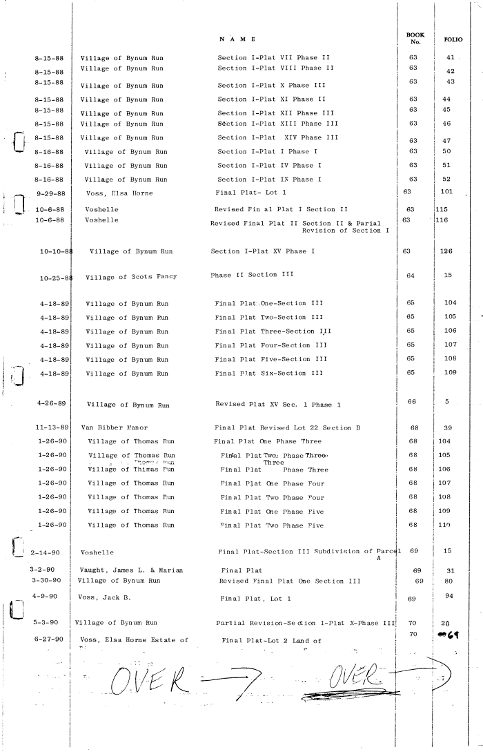 | 8-15-88 Village of Bynum Run Section I-Plat VII Phase II 63 41 8-15-88 Village of Bynum Run Section I-Plat VIII Phase II 63 42 8-15-88 Village of Bynum Run Section I-Plat X Phase III 63 43 8-15-88 Village of Bynum Run Section I-Plat XI Phase II 63 44 8-15-88 Village of Bynum Run Section I-Plat XII Phase III 63 45 8-15-88 Village of Bynum Run Section I-Plat XIII Phase III 63 46 8-15-88 Village of Bynum Run Section I-Plat XIV Phase III 63 47 8-16-88 Village of Bynum Run Section I-Plat I Phase I 63 50 8-16-88 Village of Bynum Run Section I-Plat IV Phase I 63 51 8-16-88 Village of Bynum Run Section I-Plat IX Phase I 63 52 9-29-88 Voss, Elsa Home Final Plat- Lot 1 63 101 10-6-88 Voshelle Revised Fin al Plat I Section II 63 115 10-6-88 Vo sVip lip Reviged Final plat I Section u & parial Revision of Section I 63 116 10-10-8 Village of Bynum Run Section I-Plat XV Phase I 63 126 10-25-8 Village of Scots Fancy Phase II Section III 64 15 4-18-89 Village of Bynum Run Final Plat .0ne-Sect ion III 65 104 4-18-89 Village of Bynum Run Final Plat Two-Section III 65 105 4-18-89 Village of Bynum Run Final Plat Three-Section III 65 106 4-18-89 Village of Bynum Run Final Plat Four-Section III 65 107 4-18-89 Village of Bynum Run Final Plat Five-Section III 65 108 4-18-89 Village of Bynum Run Final Plat Six-Section III 65 109 4-26-89 Village of Bynum Run Revised Plat XV Sec. 1 Phase 1 66 5 11-13-89 Van Bibber Manor Final Plat Revised Lot 22 Section B 68 39 1-26-90 Village of Thomas Run Final Plat One Phase Three 68 104 1-26-90 Village of Thomas Run Firfal Plat Two- Phase T.bree Three 68 105 1-26-90 Village of Thimas Pun Final Plat Phase Three 68 106 1-26-90 Village of Thomas Run Final PJat One Phase Four 68 107 1-26-90 Village of Thomas Run Final Plat Two Phase . our 68 108 1-26-90 Village of Thomas Run Final Plat One Phase Five 68 109 1-26-90 Village of Thomas Run in al Plat Two Phase Five 68 110 2-14-90 Voshelle Final Plat-Section III Subdivision of Parcal A 69 15 3-2-90 Vaught , James L. & Marian Final Plat 69 31 3-30-90 Village of Bynum Run Revised Final Plat One Section II 69 80 4-9-90 Voss, Jack B. Final Plat, Lot 1 69 94 5-3-90 Village of Bynum Run Partial Revision -Se at ion I-Plat X-Phase III 70 20 6-27-90 Voss, Elsa Home Estate of Final Plat-Lot 2 Land of 70 69 |