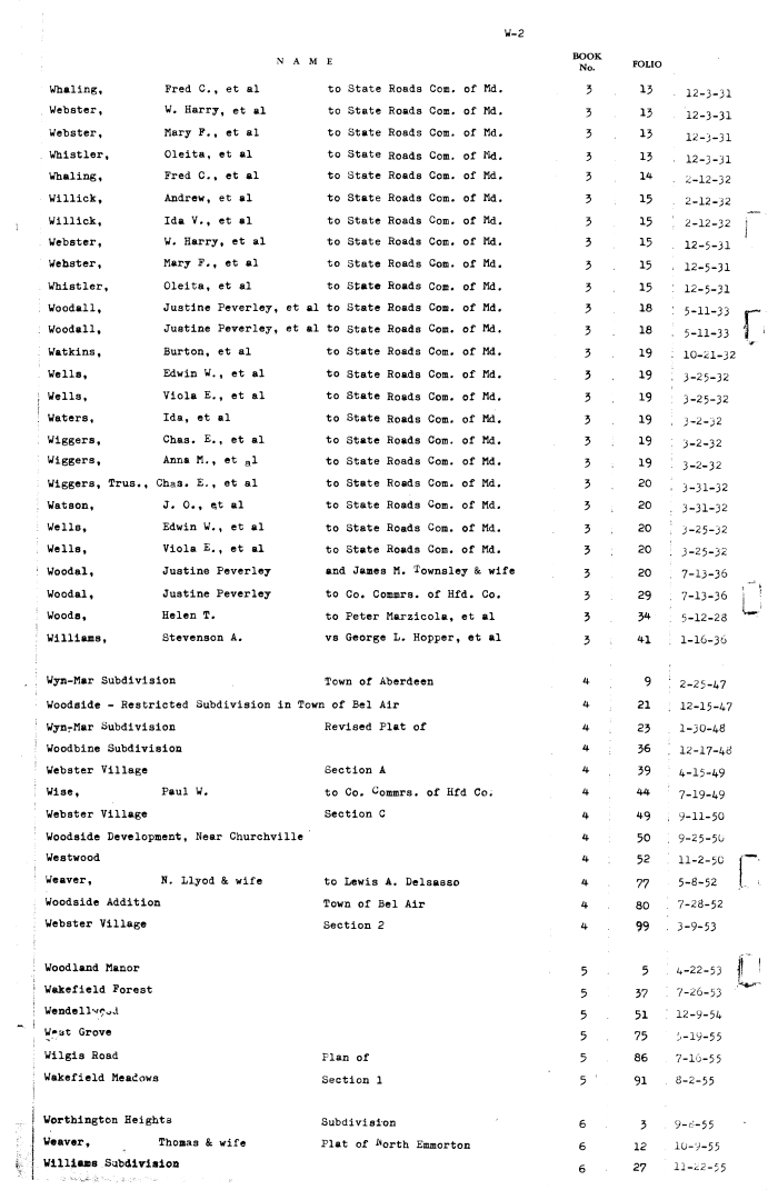 | Whaling, Fred C. , et al to State Roads Com. of Md. 3 13 12-3-31 Webster, W. Harry, et al to State Roads Com. of Md. 3 13 12-3-31 Webster, Mary P., et al to State Roads Com. of Md. 3 13 12-3-31 Whistler, Oleita, et al to State Roads Com. of Md. 3 13 12-3-31 Whaling, Fred C., et al to State Roads Com. of Md. 3 14 2-12-32 Willick, Andrew, et al to State Roads Com. of Md. 3 15 2-12-32 Willick, Ida V., et al to State Roads Com. of Md. 3 15 2-12-32 Webster, W. Harry, et al to State Roads Com. of Md. 3 15 12-5-31 Webster, Mary F., et al to State Roads Com. of Md. 3 15 12-5-31 Whistler, Oleita, et al to State Roads Com. of Md. 3 15 12-5-31 Woodall, Justine Peverley, et al to State Roads Com. of Md. 3 18 5-11-33 Woodall, Justine Peverley, et al to state Roads Com. of Md. 3 18 5-11-33 Watkins, Burton, et al to State Roads Com. of Md. 3 19 10-21-32 Wells, Edwin W, , et al to State Roads Com. of Md. 3 19 3-25-32 Wells, Viola E. , et al to State Roads Com. of Md. 3 19 3-25-32 Waters, Ida, et al to State Roads Com. of Md. 3 19 3-2-32 Wiggers, Chas. E. , et al to State Roads Com. of Md. 3 19 3-2-32 Wiggers, Anna M., et al to State Roads Com. of Md. 3 19 3-2-32 Wiggers, Trus,, Chas. E, , et al to State Roads Com. of Md. 3 20 3-31-32 Watson, J. 0,, e,t al to State Roads Com. of Md. 3 20 3-31-32 Wells, Edwin W. , et al to State Roads Com. of Md. 3 20 3-25-32 Wells, Viola E. f et al to State Roads Com. of Md. 3 20 3-25-32 Woodal, Justine Peverley and James M. ownsley & wife 3 20 7-13-36 Woodal, Justine Peverley to Co. Commrs. of Hfd. Co. 3 29 7-13-36 Woods, Helen T. to Peter Marzicola, et al 3 34 5-12-23 Williams, Stevenson A. vs George L. Hopper, et al 3 41 1-16-36 Wyn-Mar Subdivision Town of Aberdeen 4 9 2-25-47 Woodside - Restricted Subdivision in Town of Bel Air 4 21 12-15-47 WynrMar Subdivision Revised Plat of 4 23 1-30-43 Woodbine Subdivision 4 36 12-17-43 Webster Village Section A 4 39 4-15-49 Wise, Paul W. to Co. Comrnrs. of Hfd Co. 4 44 7-19-49 Webster Village Section C 4 49 9-11-50 Woodside Development, Near Churchville 4 50 9-25-50 Westwood 4 52 11-2-50 Weaver, N. Llyod & wife to Lewis A. Delsasso 4 77 5-6-52 Woodside Addition Town of Bel Air 4 80 7-23-52 Webster Village Section 2 4 99 3-9-53 Woodland Manor 5 5 4-22-53 Wakefield Forest 5 37 7-26-53 Wendellwo0si 5 51 12-9-54 Wfat Grove 5 75 19-55 Wilgis Road Plan of 5 86 7-16-55 Wakefield Meadows Section 1 5 91 8-2-55 Worthington Heights Subdivision 6 3 9-d-55 Weaver, Thomas & wife Plat of orth Emmorton 6 12 10-9-55 Williams Subdivision 6 27 11-22-55 |