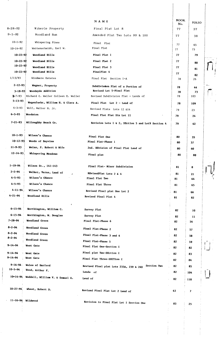 | 8-28-92 Wiherle Property Final Plat Lot 8 77 37 9-1-92 Woodland Run Amended Plat Two Lots 99 & 100 77 38 10-1-92 Whispering Pines Final Plat 77 65 10-14-92 Wattenschaidt, Earl W. Final Plat 77 75 10-22-9 Woodland Hills Final Plat 1 77 79 10-22-9 Woodland Hills Final PLat 2 77 80 10-22-9 ' Woodland Hills Final Plat 3 77 81 10-22-9 %. Woodland Hills FinalPlat 4 77 82 1/13/93 Windmere Estates Final Plat Section 1-A 78 26 2-12-93 Wagner, Property Subdivision Plat of a Portion of 78 44 3-18-93 Woodsyde Addition Revised Lot 5-Final Plat 78 73 8-7-93 Richard C. Waller Colleen E. Waller Revised Subdivision Plat - Lands of 78 103 5-13-93 Wagenfuehr, William H. & Clara A. Final Plat Lot 2 - Land of 78 109 6-3-93 Wolf, Walter M. Jr. Revised Plats Lots 12 &14 79 23 6-3-93 Woodston Final Plat Plat Six Lot II 79 24 7-21-93 Willoughby Beach Co. Revision Lots 1 & 2, SEction 5 and Lot9 Section 4 79 62 10-1-93 Wilson's Chance Final Plat One 80 35 10-12-93 Woods of Bayview Final Plat-Phase 1 80 37 11-9-93 Weiss, P. Robert & Wife 2nd. REvision of Final Plat Land of 80 60 12-14-93 Whispering Meadovs Final plat 80 88 1-19-94 Wilson St., 141-143 Final Plat- Minor Subdivision 81 8 2-2-94 Walker, Verna, Land of , REvisedPlat Lots 2 & 4 81 21 4-5-93 Wilson's CHance Final Plat Two 81 64 4-5-93 Wilson's Chance Final Plat Three 81 65 4-11-94 Wilson's Chance Revised Final plat One Lot 2 81 66 4-21-94 Woodland Hills Revised Final Plat 4 t 81 82 6-15-94 Worthington, William C. Survey Plat 82 10 6-15-94 Worthington, W. Douglas Survey Plat 82 11 7-28-94 Woodland Green Final Plat-Phase 6 82 54 8-2-94 Woodland Green Final Plat-Phase 2 82 57 8-2-94 Woodland Green Final Plat-Phase 3 and 4 82 58 8-2-94 Woodland Green Final Plat-Phase 5 82 59 9-14-94 West Gate Final Plat One-Section I 82 82 9-14-94 West Gate Final plat Two-SEction I 82 83 9-14-94 West Gate Final Plat Three-SECTion I 82 84 9-16-94 Wales of Harford Revised Final plat Lots 233A, 239 & 240 Section Two 82 85 10-5-94 Wood, Arthur F. Landg Qf 82 104 10=14-94 Waddell, William V. & Samuel E. Land of 82 110 10-27-94 Wheat, Robert D. Revised Final Plat Lot 2 Land of 63 7 11-16-94 Wildwood Revision to Final Plat Lot 1 Section One 83 25 |