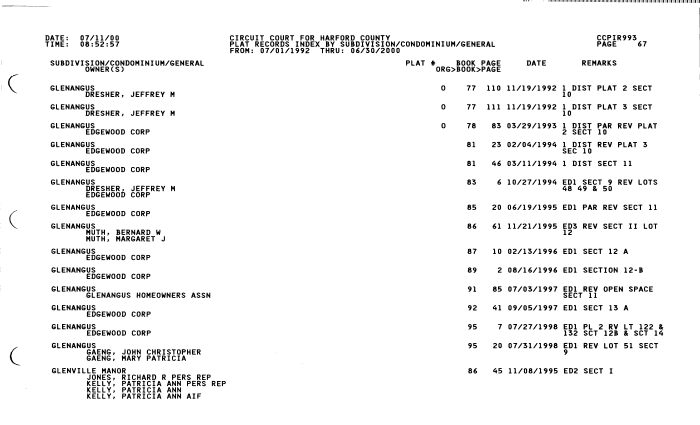 | GLENANGUS DRESHER, JEFFREY M 0 77 110 11/19/1992 1 DIST PLAT 2 SECT 10 GLENANGUS DRESHER, JEFFREY M 0 77 111 11/19/1992 1 DIST PLAT 3 SECT 10 GLENANGUS EDGEWOOD CORP 0 78 83 03/29/1993 1 DIST PAR REV PLAT 2 SECT 10 GLENANGUS EDGEWOOD CORP 81 23 02/04/1994 1 DIST REV PLAT 3 SEC 10 GLENANGUS EDGEWOOD CORP 81 46 03/11/1994 1 DIST SECT 11 GLENANGUS DRESHER, JEFFREY M EDGEWOOD CORP 83 6 10/27/1994 EDI SECT 9 REV LOTS 48 49 & 50 GLENANGUS EDGEWOOD CORP 85 20 06/19/1995 EDI PAR REV SECT 11 GLENANGUS MUTH, BERNARD W MUTH, MARGARET J 86 61 11/21/1995 ED3 REV SECT II LOT 12 GLENANGUS EDGEWOOD CORP 87 10 02/13/1996 EDI SECT 12 A GLENANGUS EDGEWOOD CORP 89 2 08/16/1996 EDI SECTION 12-B GLENANGUS GLENANGUS HOMEOWNERS ASSN 91 85 07/03/1997 EDI REV OPEN SPACE SECT 11 GLENANGUS EDGEWOOD CORP 92 41 09/05/1997 EDI SECT 13 A GLENANGUS EDGEWOOD CORP 95 7 07/27/1998 EDI PL 2 RV LT 122 & 132 SCT 12B & SCT 14 GLENANGUS GAENG, JOHN CHRISTOPHER GAENG, MARY PATRICIA 95 20 07/31/1998 EDI REV LOT 51 SECT 9 GLENVILLE MANOR JONES, RICHARD R PERS REP KELLY, PATRICIA ANN PERS REP KELLY, PATRICIA ANN KELLY, PATRICIA ANN AIF 86 45 11/08/1995 ED2 SECT I |