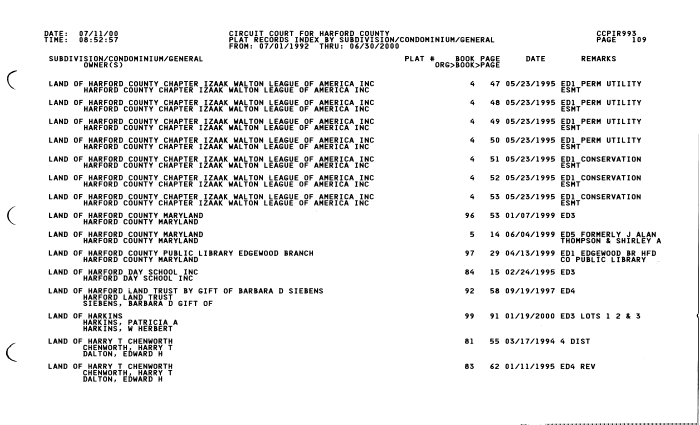 HARFORD COUNTY CIRCUIT COURT (Plats, Index) 1992-2000 MSA C2462-3-1 MSA C2462-3-1, Image No: 109 Enlarge and print image (63K) |