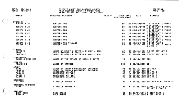 HARFORD COUNTY CIRCUIT COURT (Plats, Index) 1992-2000 MSA C2462-3-2 MSA C2462-3-2, Image No: 193 Enlarge and print image (51K) |