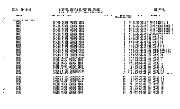 HARFORD COUNTY CIRCUIT COURT (Plats, Index) 1992-2000 MSA C2462-3-2 MSA C2462-3-2, Image No: 197 Enlarge and print image (86K) |