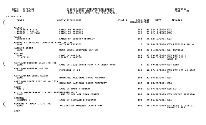 HARFORD COUNTY CIRCUIT COURT (Plats, Index) 2000-2001 MSA C2462-3-4 MSA C2462-3-4, Image No: 21 Enlarge and print image (41K) |