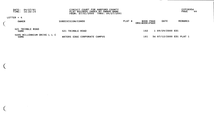 HARFORD COUNTY CIRCUIT COURT (Plats, Index) 2000-2001 MSA C2462-3-4 MSA C2462-3-4, Image No: 44 Enlarge and print image (12K) |