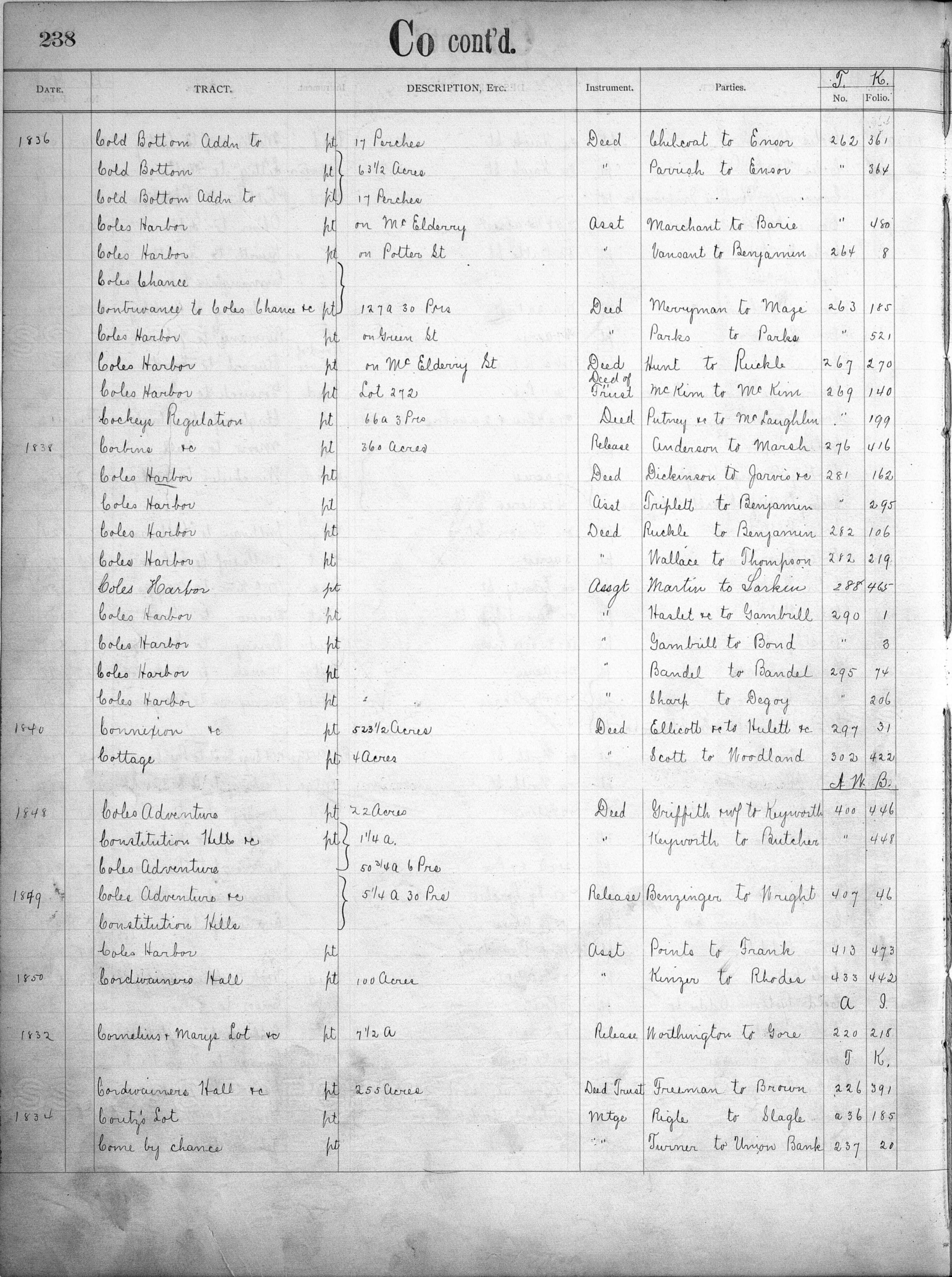 | BALTIMORE COUNTY COURT (Land Records, Tract Index) A-Jo, 1798-1851, MSA CE 15-1 Image No: 021110-0238 Enlarge and print image (1M) |
