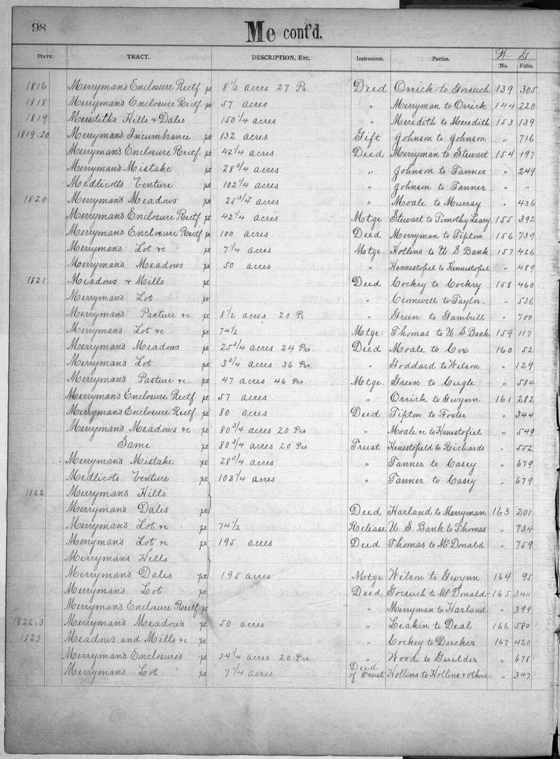 | BALTIMORE COUNTY COURT (Land Records, Tract Index) Jo-Z, 1798-1851, MSA CE 15-2 Image No: 021111-0098 Enlarge and print image (1M) |
