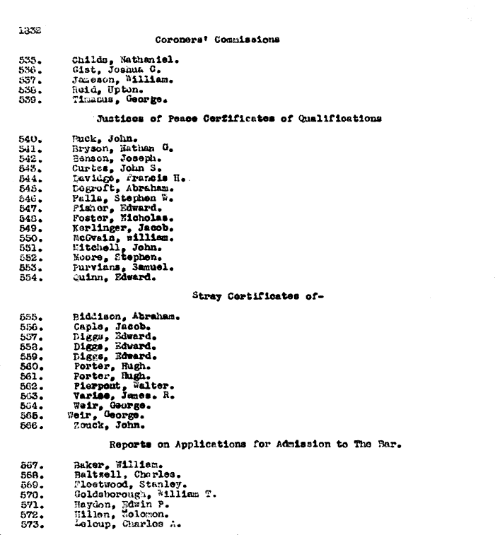 | 1832 Coroners' Commissions 535. Childs, Nathaniel. 536. Gist, Joshua C. 557. Jameson, William. 538. Baid, Up ton. 539. Timasus, George. Justices of Peace Certificates of Qualifications 540. Buck, John. 541. Bryson, Nathan G. 542. Banson, Joseph. 543. Curtes, John S. 544. Davidgo, Francis H . 545. Degroft, Abraham. 546. Falls, Stephen W. 547. Fisher, Edward. 548. Foster, Nicholas. 549. Kerlinger, Jacob. 550. McGvain, William. 551. Mitchell, John. 552. Moore, Stephen. 553. Purvians, Samuel. 554. Quinn, Edward. Stray Certificates of-- 555. Biddison, Abraham. 556. Caple, Jacob. 557. Diggs, Edward. 558. Diggs, Edward. 559. Diggs, Edward. 560. Porter, Hugh. 561. Porter, Hugh. 562. Pierpont, Walter. 563. Varise, James. R. 564. Weir, George. 565. Weir, George. 566. Zouck, John. Reports on Applications for Admission to The Bar. 567. Baker, William. 568. Baltzell, Charles. 569. Fleetwood, Stanley. 570. Goldsborough, William T. 571. Haydon, Edwin P. 572. Hillen, Solomon. 573. Leloup, Charles A. |