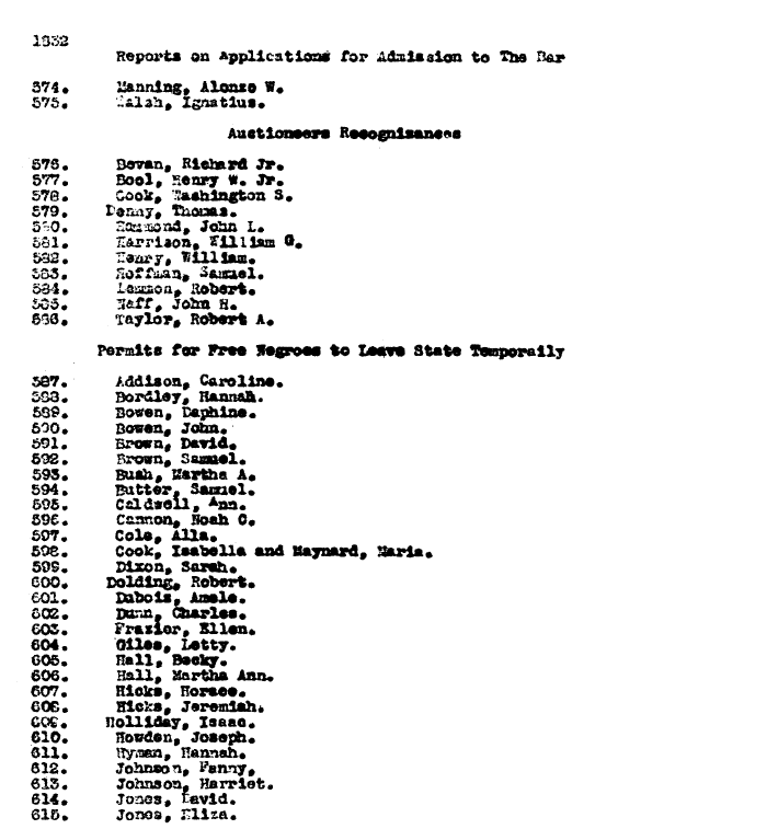 | 1832 Reports on Applications for Admission to The Bar 574. Manning, Alonzo W. 575. Walsh, Ignatius. Auctioneers Recognizances 576. Bevan, Richard Jr. 577. Bool, Henry W. Jr. 578. Cook, Washington S. 579. Denny, Thomas. 580. Hammond, John L. 581. Harrison, William G. 582. Henry, Willliam. 583. Hoffman, Samuel. 584. Lemmon, Robert. 585. Naff, John H. 586. Taylor, Robert A. Permits for Free Negroes to Leave State Temporaily Addison, Caroline. Bordley, Hannah. Bowen, Daphine. Bowen, John. Brown, David. Brown, Samuel. Bush, Martha A. Butter, Samel. Caldwell, Ann. Cannon, Noah C. Cole, Alla. Cook, Isabella and Maynard, Maria Dixon, Sarah. Dolding, Robert. Dubois, Amele. 602. Dunn, Charles. 603. Frazier, Ellen. 604. Giles, Letty. 605. Hall, Becky. 606. Hall, Martha Ann. 607. Hicks, Horace. 608. Hicks, Jeremiah. Holliday, Isaac. Howden, Joseph. Hyman, Hannah. Johnson, Fanny, Johnson, Harriet. Jones, David. Jones, Eliza. 587. 588. 589. Daphine. 600. Bowen, John. 591. Brown, David. 592. 593. 594. 595. 596. 597. Cole, Alla. 508. Cook, Isabella and Maynard, Maria. 509. Dixon, Sarah. 510. 601.. . 609. 610. 61l. 612. 613. 614. 614. Jones, David. 615. Jones,Eliza. |