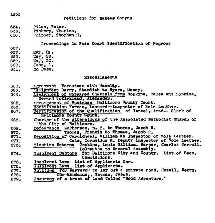| l832 Petitions for Habeus Corpus 654. Pilan, Peter. 655. Pinkney., Charles, 656. Whipper, Stephen H. Proceedings in Pass Court Identification of Negroes 657. 657. May, 28. 658. May, 29. 659. May, 30. 660. June, 1. 661. No Date. Miscellaneous 662. Agreement Vernetson with Hazelip. 663. Assignment Barry, Standish to Myers, Henry. 664. Assignment of Morgaged Chattels from Hopkins, James and Hopkins, Gerard to Kirkland, Alexander. 665. Arrangement of Business Baltimore County Court. 666. Certification Kernan, Leonard--Inspector of Sole Leather. 667. Certification of the Qualification of Israel, Arad— Clerk of Baltimore County Court. 668. Charter of the Alterations of the Associated Methodist Church of the City of Baltimore. 669. Defearance McPherson, E. B. to Thomas, Jacob R. 670. Thomas. Francis to Thomas, Jacob R. 671. Deposition of Carmichael, William as Inspector of Sole Leather. 672. Cole, Cornelius H. Deputy Inspector of Sole Leather. 673. Election Returns Jenkins, Louis William. Harper, Charles Carroll. Delegates to General Assembly. 674. lasoInsolvent Debtors for Baltimore City and County. List of Fees, Commissions. 675. Insolvent Laws List of Applicants for. 676. Insolvent Laws List of Applicants. 677. Petition for Surveyor to lay out a private road, Hazell, Henry. 678. for Mandamus, Tayman, Jacob. 679. Resurvey of a tract of land Called "Bold Adventure." |