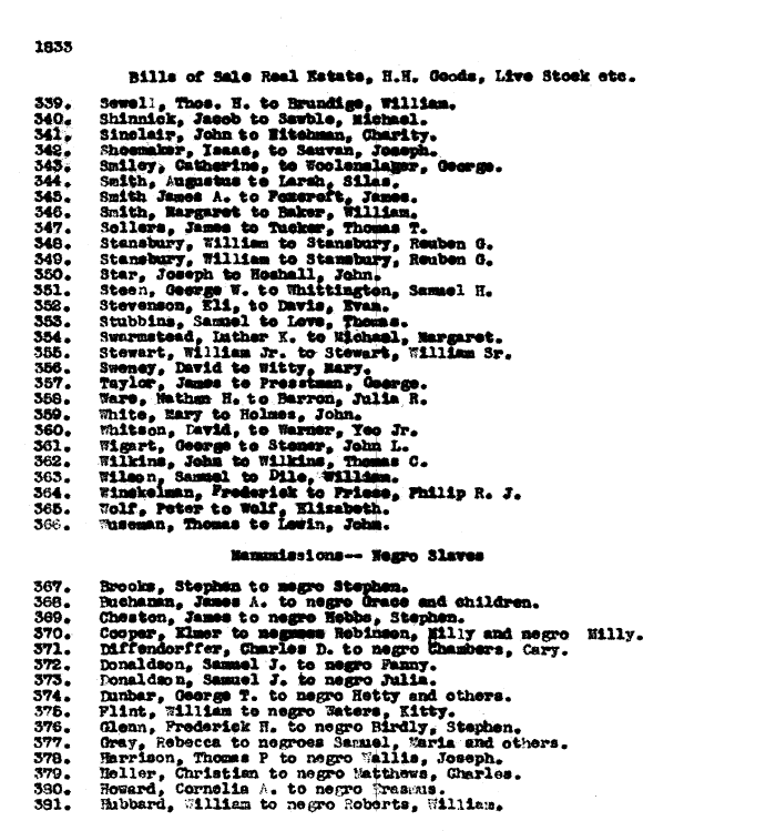 | 1833 Bills of Sale Real Estate, H.H. Goods, Live Stock etc. 339. Sewll, Thos. H. to Brundige, William. 340. Shinnick, Jacob to Sawble, Michael. 341. Sinclair, John to Eitchman, Charity. 342. Shoemaker, Isaac, to Sauvan, Joseph. 543. Smiley, Catherine, to Woolenslager, George. 344. Smith, Augustus to Larsh, Silas. 345. Smith James A. to Foxcroft, James. 346. Smith, Margaret to Baker, William. 347. Sellers, James to Tucker, Thomas T. 348. Stansbury, William to Stansbury, Reuben G. 349. Stansbury, William to Stansbury, Reuben G. 350. Star, Joseph to Hoshall, John. 351. Steen, George W. to Whittington, Samuel H. 352. Stevenson, Eli, to Davis, Evan. 353. Stubbins, Samuel to Love, Thomas 354. Swarmstead, Luther K. to Michael, Margaret. 555. Stewart, William Jr. to Stewart, William Sr. 356. Sweney, David to Witty, Mary. 357. Taylor, James to Presstman, George. 558. Ware, Nathan H. to Barron, Julia R. 359. White, Mary to Holmes, John. 360. Whitson, David, to Warner, Yeo Jr. 361. Wigart, Georgee to Stoner, John L, 362. Wilkins, John to Wilkins, Thomas C. 363. Wilson, Samuel to Dile, William. 364. Winckelman, Frederickto Friese, Philip R. J. 365. Wolf, Peter to Wolf, Elizabeth. 366. Wuseman, Thomas to Lewin, John. Manumissions— Negro Slaves 367. Brooks, Stephen to negro Stephen. 368. Buchanan, James A. to negro Qrace and children. 369. Cheston, James to negro Hobbs, Stephen. 370. Cooper, Elmer to negroes Robinson, Milly and negro Milly. 371. Diffendorffer, Charles D. to negro Chambers, Cary. 372. Donaldson, Samuel J. to negro Fanny. 373. Donaldson, Samuel J. to negro Julia. 374. Dunbar, George T. to negro Hetty and others. 375. Flint, William to negro Waters, Kitty. 376. Glenn, Frederick H. to negro Birdly, Stephen. 377. Gray, Rebecca to negroes Samuel, Maria and others. 378. Harrison, Thomas P to negro Wallis, Joseph. 379. Heller, Christian to negro Matthews, Charles. 380. Howard, Cornelia A. to negro Erasmus. 381. Hubbard, William to negro Roberts, William. |