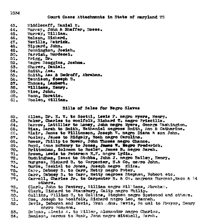 | 1834 Court Cases Attachments in State of Maryland VS 43. Middlecaff, Daniel M. 44. Murray, John & Shaffer, Moses. 45. Murray, William. 46. Nelsen, Richard. 47. Meville, Patrick. 48. Nippard, John. 49. Pennington, Josiah. 50. Parrish, Mordecai. 51. Prigg, Dr. 52. Negro Scoggins, Joshua. 53. Sharer, Daniel. 54. Smith, Asa. 55. Smith, Asa & DeGroff, Abraham. 56. Tennison, Joseph B. 57. Thomas, Lambert. 58. Williams. Henry. 59. Wise, John. 60. Wonn, Horatio. 61. Woolen, William, Bills of Sales for Negro Slaves 62. Allen, Dr. E. W. to Scotti, Lewis F. negro Myers, Henry. 63. Baker, Charles to Woolfolk, Richard T. negro Priscilla. 64. Barrow, Lattillar to Loney, John negro Myers, George Washington, 65. Bias, Sarah to Smith, Nathaniel negroes Smith, Ann & Catherine. 66. Blair, James to Williamson, Joseph W. negro Diana & son John. 67. Bosley, James to Ridgely, Noah negro Caroline. 68. Bower, Philip to Bower, John Thomas negro Chance. 69. Boyd, Anna McHenry to Jones, James W. Negro Frederick. 70. Brittonham, Solomon to Bosley, James B. negro Sarah. 71. Brown, Lewis to Peterson H.F. negro Lydia. 72. Buchingham, Isaac to Stubbs, John J. negro Bailey, Henry. 73. Burgess, Richard B. to Carpenter, H. & Co. negro John. 74. Burke, Ezekiel to Jones, Joseph negro Eliza. 75. Carr, Dabney S. to Carr, Hetty negro Peter. 76. Carr, Dabney S. to Carr, Hetty negroes Stephen, Robert etc. 77. Carroll, Charles Jr. to Carpenter H. & Co. negroes Burgess, Nace & 14 others. 78. Clark, John to Fantroy, William negro Williams, Abraham. 79. Clark, Richard to Stansbury, Calip negro Philip. 80. Collins, William H. to Collins, Stephen negro Spotwood and others. 81. Cos, Joseph to Woolfolk, Richard negro Lee, Hannah. 82. Davis, Deborah and Davis, Evan Adams. Davis, Samuel to Freyer, Henry negro Susanna. 83. Delsaas, Alexis A. to Willer, Alexander negro Charles. 84. Denison, Marcus to Busk, John negro Mitchell, Sarah. |