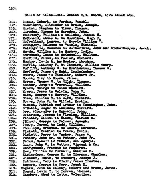 | 1834 Bills of Sales—Real Estate H.H. Goods, Live Stock etc. 266. Lucas, Robert, to Jordan, Samuel. 267. Mackenzie, Alexander to Green, Joseph. 268. Market, Stephen to Nizer, Thomas. 269. Marsden, Thomas to Marsden, John. 270. McCumsey, William to Sellman, Joshua S. 271. McDonald, Abaer K. to Harris cm, Sogh J. 272. McFrailand, Lauren to Harris William G. 273. McHanney, Soloman to Sauble, Michael. 274. McLaughlin, Rosanna to Culbertson, John and Eichelberger, Jacob. 275. Meeds, William A. to Hughes, Lydia. 276. Merchant, Isaac to McConnell, William. 277. Merford, James to Fowler, Richard. 278. Mester, Levin R. to Mester, Abraham. 279. Moffit, Anthonyu F. to Stewart, William Henry. 280. Moffitt, Anthony G. to Brotherton, Thomas W. 281. Morford, James to Hunt, Louis Cockey. 282. Moore, James to Sinclair, Robert Jr. 283. Moore, Mary to Moore, James. 284. Morse, Thomas W. to Wildy, Thomas. 285. Mosher, John to Greewill, William. 286. Myers, George to Johns Richard. 287. Myers, Jesse to Colvin, John D. 288. Nace, George to Murray, William. 289. Nace, William M. to Ward, Richard. 290. Noyes, John P. to Gillet, Martin. 291. Nugent, Patrick and Arthur to Cunningham, John. 292. O'Neale, Roger to Lawless, Richard. 293. Orr, Alexander to Russell, John. 294. Osterman, Joseph to Fleming, William. 295. Painter, Samuel to Hicks, Charles G. 296. Palmer, George to Palmer, Joseph. 297. Perry, Israel to Ladd, William. 298. Phillips, Bristow. to Moore, Abraham. 299. Pickett, Ezekiel to Evans, David. 300. Pickett, Perry to Tucker James A. 301. Potter, John Sr. to Potter, John J. 302. Price, Howell to Dawson, Ann Agneys. 303. Quay, John C. to Sutton, Vincent & Co. 304. Rairgneauk, Francis to Fondirat. 305. Rea, William to Purnell, Charles B. 306. Richardson, George R. to Tiernan, Charles. 307. Rinaman, Isaiah, to Stewart, Joseph J. 308. Robinson, Mary to Blair, James Trustee. 309. Rogers, George to Kerr, Jacob R. 310. Rogers, John to Galway, Robert and Brown, James. 311. Round, Levin T. to Dorman, Thomas. 312. Sanders, Obed to Lutts, Valentine. |