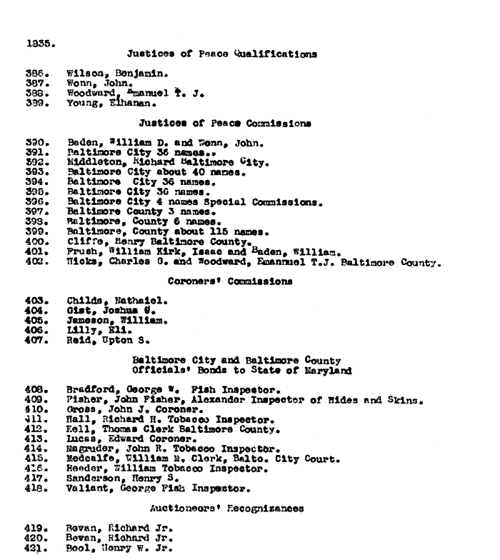 | 1835. Justices of Peace Qualifications 386. Wilson, Benjamin. 387. Wonn, John. 388. Woodward, Emanuel T. J. 389. Young, Elhanan. Justices of Peace Comissions 390. Baden, William D. and Wonn, John. 391. Baltimore City 36 names. 392. Middleton, Richard Baltimore City. 393. Baltimore City about 40 names. 394. Baltimore City 36 names. 395. Baltimore City 36 names. 396. Baltimore City 4 names Special Commissions. 397. Baltimore County 3 names. 398. Baltimore County 6 names. 399. Baltimore County about 115 names. 400. Cliffe, Henry Baltimore County. 401. Frush, William Kirk, Isaac and Baden, William. 402. Hicks, Charles G. and Woodward, Emannuel T.J. Baltimore County. Coroners* Cocsaissions 403. Childs, Nathaiel. 404. Gist, Joshua 0. 405. Jameson, William. 406. Lilly, Eli. 407. Reid, Upton S. Baltimore City and Baltimore County Officials' Bonds to State of Maryland 408. Bradford, George W. Fish Inspector. 409. Fisher, John Fisher, Alexander Inspector of Hides and Skins. 410. Gross, John J. Coroner. 411. Hall, Richard H. Tobacco Inspector. 412. Kell, Thomas Clerk Baltimore County. 413. Lucas, Edward Coroner. 414. Magruder, John R. Tobacco Inspector. 415. Medcalfe, Wllliam M. Clerk, Balto. City Court. 416. Reeder, William Tobacco Inspector. 417. Sanderson, Henry S. 418. Valiant, George Fish Inspector. Auctioneers' Recognizances 419. Bevan, Richard Jr. 420. Bevan, Richard Jr. 421. Bool, Henry W. Jr. |