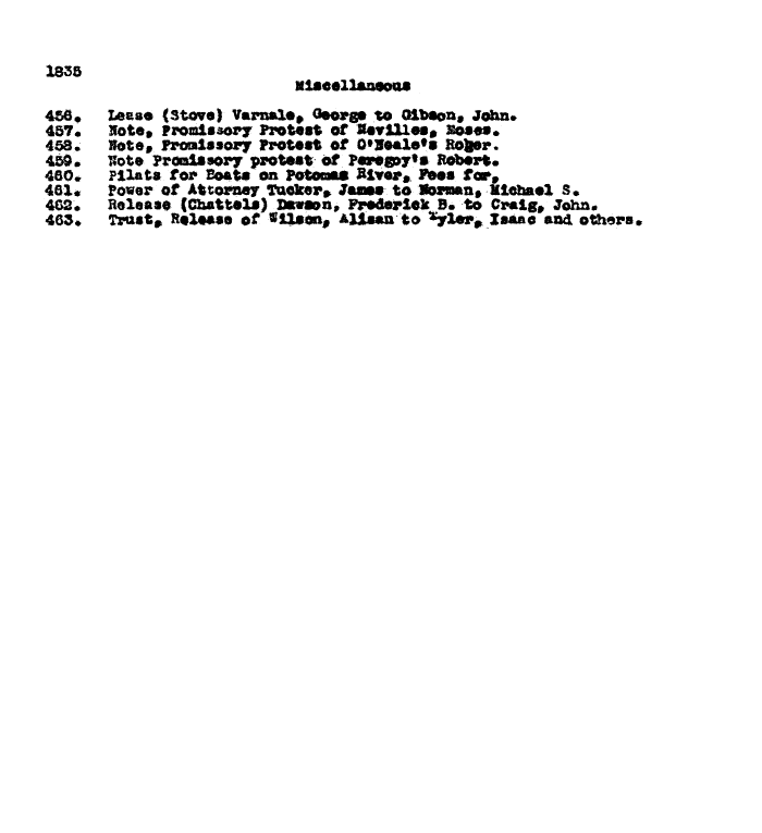 | 1835 Miscellaneous 456. Lease (Stove) Varnale, George to Gibson, John. 457. Note, Promissory Protest of Mevilles, Moses. 458. Note, Promissory Protest of O'Neale' Roger. 459. Note Promissory protest of Peregoy's Robert. 460. Pilots for Boats on Potomac River, Fees for, 461. Power of Attorney Tucker, James to Morman, Michael S. 462. Release (Chattels) Dawson, Frederick B. to Craig, John. 463. Trust, Release of Wilson, Alisan to Tyler, Isaac and others. |