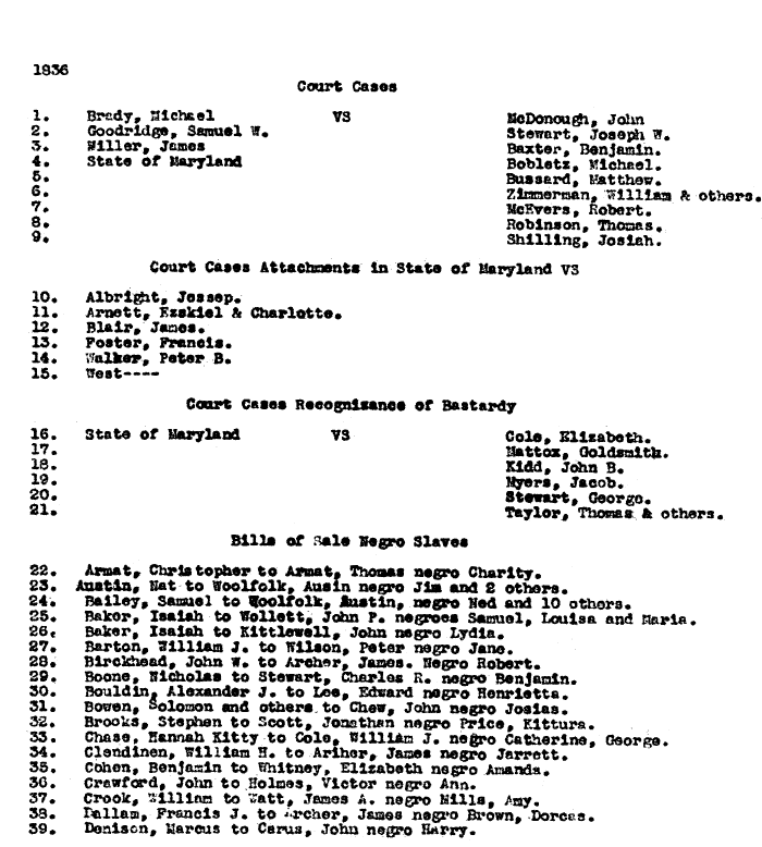 | 1836 Court Cases 1. Brady, Michael VS BcDonougi, John 2. Goodridge, Samuel W. Stewart, Joseph W. 3. Miller, James Baxter, Benjamin. 4. State of Maryland Bobletz, Michael. 5. Bussard, Matthew. 6. Zimmerman, William ft others. 7. HcEvers, Robert. 8. Robinson, Thomas. 9. Shilling, Josiah. Court Cases Attachments In State of Maryland VS 10. Albright, Jessep. 11. Arnett, Ezekiel & Charlotte. 12. Blair, James 13. Foster, Francis. 14. Walker, Peter B. 15. West—— Court Cases Recognisance of Bastardy 16. State of Maryland 73 Cole, Elizabeth. 17. Mattox, Goldsmith. 18. Kidd, John B. 19. Myers, Jacob. 20. Stewart, George. 21. Taylor, Thomas & others. Bills of Sale Negro Slaves 22. Armat, Christopher to Armat, Thomas negro Charity. 23. Austin, Nat to Woolfolk, Austin negro Jim and 2 others. 24. Bailey, Samuel to Woolfolk, Austin, negro Ned and 10 others. 25. Baker, Isaiah to Wollett, John P. negroes Samuel, Louisa and Maria. 26. Baker, Isaiah to Kittlewell, John negro Lydia. 27. Barton, William J. to Wilson, Peter negro Jane. 28. Birckhead, John W. to Archer, James. Negro Robert. 29. Boone, Nicholas to Stewart, Charles R. negro Benjamin. 30. Bouldin, Alexander J. to Lee, Edward negro Henrietta. 31. Bowen, Solomon and others to Chew, John negro Josias. 32. Brooks, Stephen to Scott, Jonathan negro Price, Klttura. 33. Chase, Hannah Kitty to Cole, William J. negro Catherine, George. 34. Clendinen, William H. to Ariher, James negro Jarrett. 35. Cohen, Benjamin to Whitney, Elizabeth negro Armands. 36. Crawford, John to Holmes, Victor negro Ann. 37. Crook, William to Watt, James A. negro Mills, Amy. 38. Dallam, Francis J. to Archer, James negro Brown, Dorcas. 39. Denison, Marcus to Carus, John negro Harry. |