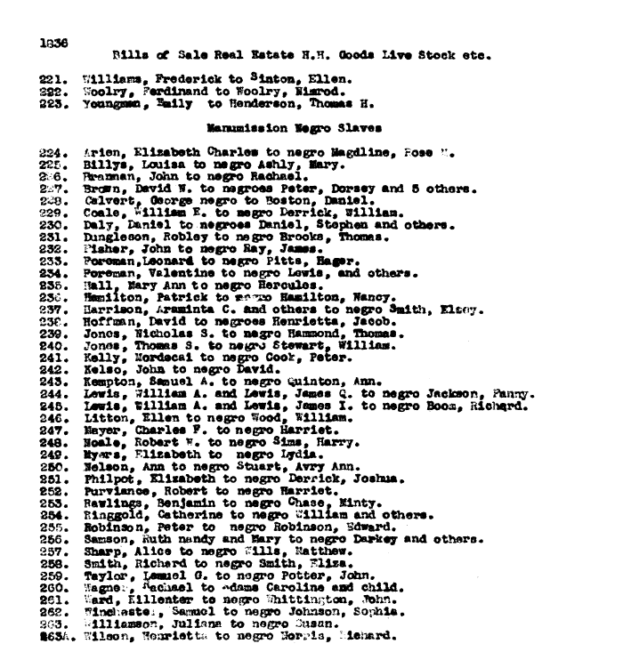 | 1836 Bills of Sale Real Estate H.H. Goods Live Stock ete. 221. Williams, Frederick to Sinton, Ellen. 222. Woolry, Ferdinand to Woolry, Nimrod. 223. Youngman, Emily to Henderson, Thomas H. Manumission Negro Slaves 224. Arien, Elizabeth Charles to negro Magdline, Rose M. 225. Billys, Louisa to negro Ashly, Mary. 226. Brannan, John to negro Rachael. 227. Brown, David W. to negroes Peter, Dorsey and 5 others. 228. Calvert, George negro to Boston, Daniel. 229. Coale, William E. to negro Derrick, William. 230. Daly, Daniel to negroes Daniel, Stephen and others. 231. Dungleson, Robley to negro Brooks, Thomas. 232. Fisher, John to negro Bay, James. 233. Foreman, Leonard to negro Pitts, Hager. 234. Foreman, Valentine to negro Lewis, and others. 235. Hall, Mary Ann to negro Hercules. 236. Hamilton, Patrick to negro Hamilton, Nancy. 237. Harrison, Araminta C. and others to negro Smith, Elsey. 238. Hoffman, David to negroes Henrietta, Jacob. 239. Jones, Nicholas S. to negro Hammond, Thomas. 240. Jones, Thomas S. to negro Stewart, Williams. 241. Kelly, Mordacai to negro Cook, Peter. 242. Kelso, John to negro David. 243. Kempton, Samuel A. to negro Quinton, Ann. 244. Lewis, William A. and Lewis, James Q. to negro Jackson, Fanny. 245. Lewis, William A. and Lewis, James I. to negro Boom, Richard. 246. Litton, Ellen to negro Wood, William. 247. Mayer, Charles P. to negro Harriet. 248. Noale, Robert W. to negro Sims, Harry. 249. Myers, Elizabeth to negro Lydia. 250. Nelson, Ann to negro Stuart, Avry Ann. 251. Philpot, Elizabeth to negro Derrick, Joshua. 252. Purviance, Robert to negro Harriet. 253. Rawlings, Benjamin to negro Chase, Minty. 254. Ringgold, Catherine to negro William and others. 255. Robinson, Peter to negro Robinson, Edward. 256. Samson, Ruth nandy and Mary to negro Darkey and others. 257. Sharp, Alice to negro Wills, Matthew. 258. Smith, Richard to negro Smith, Eliza. 259. Taylor, Lemuel G. to negro Potter, John. 260. Wagner, Rachael to Adams Caroline and child. 261. Ward, Killenter to negro Whittington, John. 262. Winchester, Samuel to negro Johnson, Sophia. 263. Williamson, Juliana to negro Susan. 263A. Wilson, Henrietta to negro Norris, Richard. |
