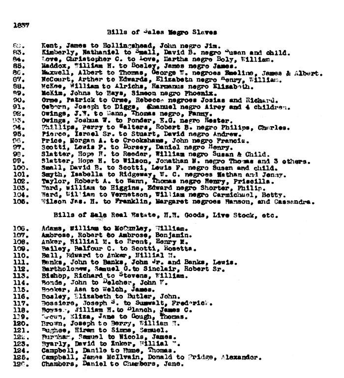 | 1837 Bills of Sales Negro Slaves 82. Kent, James to Hollingshead, John negro Jim. 83. Kimberly, Nathaniel to Small, David B. negro Susan and child. 84. Love, Christopher C. to Love, Martha negro Boly, William. 85. Maddox, William H. to Bosley, James negro James 86. Maxwell, Albert to Thomas, George W. negroes Emeline, James & Albert, 87. McCourt, Arther to Edwards, Elizabeth negro Henry, William. 88. McKee, William to Alrichs, Hanaanus negro Elizabeth. 89. McKim, Johns to Hays, Simeon negro Phoenix. 90. Orme, Patrick to Orme, Rebecca negroes Josias and Richard. 91. Osborn, Joseph to Diggs, Samuel negro Airey and 4 children. 92. Owings, J.W. to Wann, Thomas negro, Fanny. 93. Owings, Joshua W. to Ponder, E.G. negro Hester. 94. Phillips, Perry to Walters, Robert B. negro Philips, Charles. 95. Pierce, Israel Sr. to Stuart, David negro Andrew. 96. Price, Morgan A. to Crookshaus, John negro Francis. 97. Scotti, Lewis F. to Dorsey, Daniel negro Henry. 98. Slatter, Hope H. to Reedor, William negro Susan & Child. 99. Slatter, Hope H. to Wilson, Jonathan B. negro Thomas and 3 others. 100. Small, David B. to Scotti, Lewis F. negro Susan and child. 101. Smyth, Isabella to Ridgeway, W. C. negroes Nathan and Jenny. 102. Taylor, Robert A. to Wann, Thomas negro Henry, Priscilla. 103. Ward, William to Higgins, Edward negro Shorter, Philip. 104. Ward, William to Vernetson, William negro Carmichael, Betty. 105. Wilson Jas. H. to Franklin, Margaret negroes Hanson, and Cassandra. Bills of Sale Real Estate, H.H. Goods, Live Stock, etc. 106. Adams,William to McCauley, William. 107. Ambrose, Robert to Ambrose, Benjomin. 108. Anker, Hillial M. to Brent, Henry B. 109. Bailey, Balfour C. to Scotti, Rosetta. 110. Bell, Edward to Anker, Hillial M. 111. Banks, John to Banks, John Jr. and Banks, Lewis. 112. Bartholomew, Samuel G. to Sinclair, Robert Sr. 113. Bishop, Richard to Stevens, William. 114. Bonde, John to Delcher, John W. 115. Booker, Asa to Welch, James. 116. Bosley, Elizabeth to Butler, John. 117. Bossiere, Joseph S. to Sumwalt, Frederick. 118. Bowser, William H. to Blanch, James C. 119. Brown, Eliza, Jane to Gough, Thomas. 120. Brown, Joseph to Berry, William H. 121. Bughee, Hiram to Simms, Samuel. 122. Bunham, Samuel to Nicols, Jones. 123. Byarly, David to Enkor, Hillial M. 124. Campbell, Danile to Hume, Thomas. 125. Campbell, James McIlvain, Donald to Pridge, Alexander. 126. Chambers, Daniel to Chambers, Jane. |