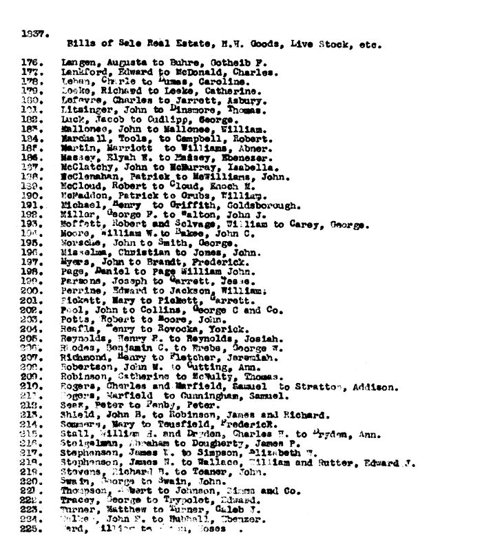 | 1837. Bills of Sale Real Estate, H.H. Goods, Live Stock, etc. 176. Langen, Augusta to Buhre, Gotheib P. 177. Lankford, Edward to McDonald, Charles. 178. Leban, Charle to Dumas. Caroline. 179. Leeke, Richard to Leeke, Catherine. 180. Lefevre, Charles to Jarrett, Asbury. 181. Litsinger, John to Dinsmore, Thomas. 182. Luck, Jacob to Cudlipp, George. 183. Mallonee, John to Mallonee, William. 184. Marchall, Tools, to Campbell, Robert. 185. Martin, Marriott to Williams, Abner. 186. Massey, Elyah E. to Massey, Ebenezer. 187. McClatchy, John to McMurray, Isabella. 188. McClenahan, Patrick to McWilliams, John. 189. McCloud, Robert to Cloud, Enoch M. 190. McFaddon, Patrick to Grubs, William. 191. Michael, Henry to Griffith, Goldsboraugh. 192. Miller, George P. to Walton, John J. 193. Moffett, Hober-t and Selvage, Gillian to Carey, 0«orgs. 194. Moore, William W. to Bakee, Jolm C. 195. Morsche, John to Smith, George. 196. Misselma, Christian to Jones, John. 197. Myers, John to Brandt, Frederick. 198. Page, Daniel to Page William John. 199. Parsons, Joseph to Garrett, Jesse. 200. Perrine, Edward to Jackson. William. 201. Pickeett, Mary to Pickett, Garrett. 202. Pool, John to Collins, George C and Co. 203. Potts, Robert to Moore, John. 204. Reafla, Henry To Rovocka, Yorick. 205. Reynolds, Henry F. to Reynolds, Josiah. 206. Rhodes, Benjamin C. to Krebs, George W. 207. Richmond, Henry to Fletcher, Jeremiah. 208. Robertson, John W. to Cutting, Ann. 209. Robinson, Catherine to McNulty, Thomas. 210. Rogers, Charles and Wairfield, Samuel to Stratton, Addison. 211. Rogers, Warfield to Cunningham, Samuel. 212. Seez, Peter to Penby, Peter. 213., Shield, John B. to Robinson, James and Richard 214. Sommers, Mary to Teusfield, Frederick. 215. Stall, William H. and Dryden, Charles H. to Dryden, Ann. 216. Steigelman, Abraham to Dougherty, James P. 217. Stephenson, James W. to Simpson, Elizabeth W. 218. Stephenson, James N. to Wallace, William and Rutter, Edward J. 219. Stevens, Richard B. to Teaner, John. 220. Swain, George to Swain, John. 221. Thompson, Robert to Johnson, Simms and Co. 222. Tracey, George to Trypolet, Edward. 223. Turner, Matthew to Turner, Caleb J. 224. Walker, John F. to Hubball, Ebenzer. 225. Ward, William to Dyson, Moses A. |