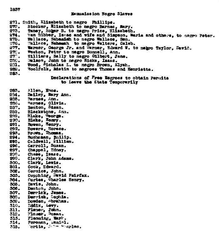 | 1837 Manumission Negro Slaves 271. Smith, Elizabeth to negro Phillips. 272. Stocker, Elizabeth to negro Barnes. Mary. 273. Taney, Roger B. to negro Price, Elisabeth. 274. Van Bibber, Issac and wife and Simpson, Maria and others, to negro Peter, 275. Wallace, Nehemiah to negro Wallace, Ben. 276. Wallace, Nehemiah to negro Walters, Caleb. 277. Warner, George Jr. and Warner, Edward W. to negro Taylor, David. 278, Weston, Peter to negro Donnell, Ann. 279. Williams, Sally to negro Gilbert, Jane. 280. Walson, John to negro Hicks, Isaac. 281. Wood, Nicholas I. to negro Brown, Elyah. 282. Woolfolk, Martin to negroes Thomas and Henrietta. 283. Declarations of Free Negroes to obtain Permits to Leave the State Temporarily 283. .Allen, Enos 284. Bailey, Mary Ann. 285. Barnes, Ann. 286. Barnes, Olivia. 287. Benton, Susan. 288. Blackstone, Ann. 289. Blake, George. 290. Blake, Henry. 291. Bowen, Henry. 292. Bowers, Horace. 293. Brown, Thomas. 294, Buchanan, Philip. 295. Caldwell, William. 296. Carroll, Susan. 297, Chappel, Edney. 298. Chase, Isaac. 299. Clark, John Adams. 300. Clark, Lewis. 301. Cook, Edward. 302. Cornice, John. 303. Cupphing, David Fairfax. 304. Curtes, Charles Henry. 305 Davis, John. 306. Denton, John. 307. Derrick, James. 308. Derrick, Sophia. 309. Dowden, Abraham 310. Eddix, Levy. 311. Flamer, John. 312. Flamer, Susan, 313. Flemming, Mark . 314. Foreman, Daniel 315, Fortie, John Charles |