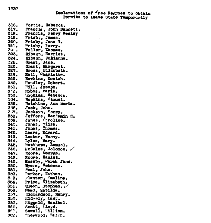 | 1837 Declarations of Free Negroes to Obtain Permits to Leave State Temporarily 316. Fortie, Rebecca. 317. Francis, John Bennett. 318. Francis, Perry Wesley 319. Frisby, James. 320. Frisby, Jane If. 321. Frisby, Perry. 322 . Fuller, Thomas. 323. Gibson, Harriet. 324. Gibson, Juilanna. 325. Grant, Jane. 336. Grant, Margaret. 327. Gross, Elizabeth. 328. Hall, Charlotte 329. Hawkins, Kesiah. 330* Hendley, Robert. 331. Hill, Joseph. 332 Hobbs, Maria 333. Hopkins, Rebeeca. 334. Hopkins, Samuel. 335. Hutchins, Ann Maria. 336. Jack, John. 337. Jackson, Henry. 338 Jeffers, Benjamin B. 339. Jones, Caroline 340* Jones, Eliza. 341. Jones, Thomas. 342. Lears, Edward* 343. Lester, Nanny. 344. Lyles, Mary. 345. Matthews, Samuel. 346. McCales. Solomon. 347. Moore, George. 348. Moore, Hamlet. 349. Moseby, Sarah Jane. 350. Myers, Rebecca. 351. Neal, John. 352. Parker, Nathan. 353. Planter, Emaline. 354. Price, Elizabeth 355. Queen, Stephen. 356. Reed, Matilda. 357. Richardson, Henry, 358. Ridgely, Lucy. 359. Riggold, Hanibal. 360. Scott, Lloyd. 361. Sewell, William. 362. Sherwood,Ralph |