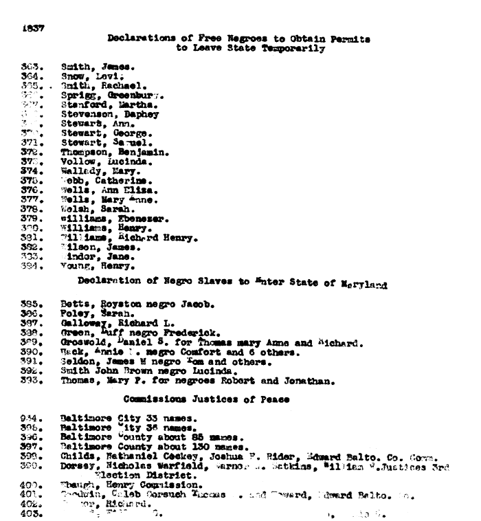 | 379. 380. 381. 382. 383. 1837 Declarations of Free Negroes to Obtain Permits to Leave State Temporarily 363. Smith, James 364. Snow, Levi 365 Smith, Rachael. 366. Sprigg, Greenbury 367 Stanford, Martha. 368 Stevenson, Daphey 369 Stewart, Ann. 370. Stewart, George. 371. stewart, Samuel. 372. Thompson, Benjamin. 373 . Vollow, Lucinda. 374. Wallady, Mary. 375. Webb, Catherine. 376. Wells, Ann Eliza. 377. Wells, Mary Anne. 378. Welsh, Sarah. •*™> Williams, Ebenezer williams, Henry, williams, Richard Henry. Wilson, James. Winder, Jane. Young, Henry. Declaration of Negro Slaves to Enter State of Maryland 385. Betts, Royston negro Jacob. 366. Foley, Sarah. 387. Galloway, Richard L. 339. Green, Duff negro Frederick. 3^9, Groswold, Daniel for Thomas Mary Anne and Richard. 390. Hack, Annie negro Comfort and 6 others. 391. Seldon, Janes M negro Tom and others. 59i. Smith John Brown negro Lucinda. 395. Tbocias, Stry P. for negroes Robert and Jonathan. Commissions Justices of Peace 034. Baltimore City 33 names. 3^5. Baltimore City 36 names. 3*0. Baltimore county about 86 names. 397. Baltimore County about 150 names. 308. Childs, Nathaniel Cockey, Joshua Rider, Edward Balto. Co. Comm 399. Dorsey, Nicholas Warfield, Warner W. Watkins, Willaim Justices 3rd Election District. 400. Ebaugh, Henry Commission. 401.. Goodwin, Caleb Gorsuch Thomas Edward, :Howard, Edward Balto. Co. 40"i« Hooker, Richard 403. Howard, William G. Jenkins, Mark and Stinchcomb, Beale C. |