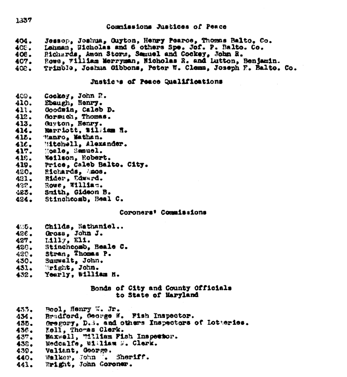 | 1837 Commissions Justices of Peace 404. Jessop, Joshua, Guyton, Henry Pearce, Thomas Balto Co. 405. Lehman, Nicholas and 6 others Spe. Jof. P. Balto. Co. 406. Richards, Amon Storm, Samuel and Cockey, John 8. 407. Rowe, William Merryman, Nicholas Band Lutton, Benjamin. 408. Trimble, Joshua Gibbons, Peter W. Clemm, Joseph F. Balto. Co. Justices of Peace Qualifications 409. Cockey, John £. 410. Ebaugh, Henry. 411. Goodwin, Caleb D. 412. Gorsuch, Thomas. 413. Guyton, Henry. 414. Marriott, William H. 415. Manro, Nathan. 416. Mitcell, Alexander. 417. Moale, Samuel. 41C. Neilson, Robert. 419. Price, Caleb Balto. City. 420. Richards, Amos. 421. Rider, Edward. 42?. Rowe, William. 4E3. Smith, Gideon B. 424. Stinchcomb, Beal C. Coroners' Commissions 4<:5. Childs, Nathaniel.. 4S€. Gross, John J. 427, Lilly, Eli. 420. stinchcomb, Beale C. 43?. Stran, Thomas P. 430. Sumwalt, John. 431. Wright, John. 432. Yearly, William H. Bonds of City and County Officials to State of Maryland 435. Bool, Henry W. Jr. 434. Bradford, George W. Fish Inspector. 435. Gregory, D.S. and others Inspectors of Lotteries. 436. Kell, Thomas Clerk. 43*?. Maxwell, William Fish Inspector. 43^. Medcalfe, William Clerk. 439. Valiant, George 440. Walker, John *. Sheriff. 441. Wright, John Coroner. |