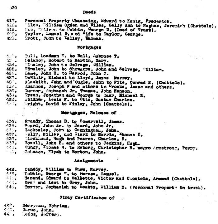 | 1839 Deeds 417. Personal Property Chassaing, Edward to Konig, Frederick. 418. Niles, William Ogden and Niles, Sally Ann to Hughes, Jeremiah (Chattels) 419. Poe, Neilsen to Dobbin, George W (Deed of Trust). 420. Taylor, Leamuel G. and wife to Taylor, George. 421. Trott, John to Talley, Thomas. Mortgages 422. Bull, Loadman E. to Bull, Ambrose T. 423 Delaney, Robert to Martin, Mary. 424. Hinsley, John to Selrage, William. 425. Hinsley, John to Showacre, John and Selvage, William. 426. Lane, John H. to Harrod, John J. 427. McBlair, Michael to Lloyd, James Murray. 428. Flaskitt, John and Cugle, John to Fite, Conrad R. (Chattels). 429. Shannon, Joseph P and others to Brooks, Isaac and others. 430. Turner, Zephanah Jr. Thames, John Hanson. 431. Tyson, Jonathan and George to Baer, Michael S. 432. Weidner, Lewis F. to Otto, Qustav Charles. 433. Wright, David to Finlay, John (Chattels). Mortgages, Release of 434. Grundy, Thomas B. to Somervell, James. 435. Board, John Sr. to Beard, John Jr. 436. Hackesley, John to Cunningham, John. 437. Kelly, Miller, and Clark to Morris, Thomas C. 438. Birckhead, Hugh and Pearce, Charles, R. 439. Howell, John B. and others to Jenkins, Hugh. 440. Gundy, Thomas B. to Raborg, Christopher H. negro Armstrong, Perry. 441. Johnson, Elyah to Norton, John. Assignments 442. Canedy, William to Chew, Harvey. 443. Dobbin, George W. to Barnes, Samuel. 444. Garand, Edward to Vallette, Victor and Caortois, Armand (Chattels). 445. Gray and Lent to Gray, John. 446. Turner, Zephaniah to Beatty, William H. (Personal Property in trust). Stray Certificates of 447. Berryman, Ephriam. 448. James, John 449. Medes, Jeffery. |