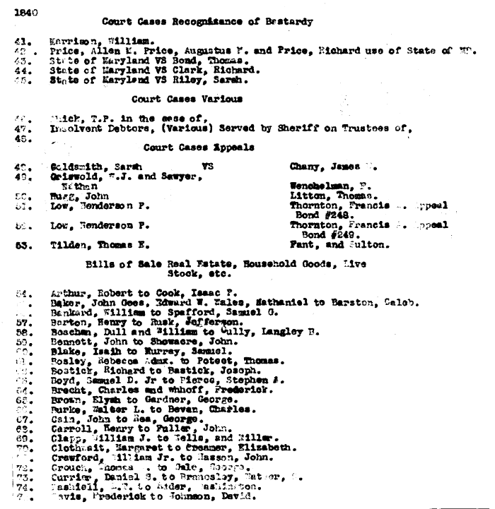 | 1840 Court Cases Recognizance of Bastardy 41. Harrison. William 42 . Price, Allen M. Price, Augustus M. and Price, Richard use of state of MD. 43. State of Maryland VS Bond, Thomas. 44. State of Maryland VS Clark, Richard. 45. State of Maryland VS Riley, Sarah. Court Cases Various 46. Ahick, T.P. in the case of, 47. Insolvent Debtors, (Various) Served by Sheriff on Trustees of, 48. ,. Court Cases Appeals 48, Goldsmith, Sarah VS Charry, James. 49. Griswold, W.J. and Sawyer, Nathan Wenchelman, F. 50. Hugg, John Litton, Thomas. 51. Low, Bonder son P. Thornton, Francis A. Appeal Bond #248. 52. Low, Henderson P. Thornton, Francis A. Appeal Bond #249. 53. Tilden, Thomas E. Fant, and Sulton. Bills of Sale Real Estate, Household Goods, Live Stock, etc. 54. Arthur, Robert to Cook, Isaac P. 55. Baker, John Gees, Edward W. Wales, Nathaniel to Barston, Caleb. 56. Bankard, William to Spafford, Samuel G. 57. Barton, Henry to Rusk, Jefferson. 58. Beachan, Dull and William to Cully, Langley B. 59. Bennett, John to Showacre, John. 60. Blake, Isaiah to Murray, Samuel. 61. Bosley, Rebecca Admr. to Poteet, Thomas. 62. Bostick, Richard to Bastick, Joseph. 63. Boyd, Samuel D. Jr. to Pierce, Stephen A. 64. Brecht, Charles and whnoff, Frederick. 65. Brown, Elyah to Gardner, George. 66. Burke, Walter L. to Beven, Charles. 67. Cain, John to Rea, George. 68. Carroll, Renry to Taller, John. 69. Clapp, William J. to Wells, and Miller. 70. Clothwait, Margaret to Creamer, Elizabeth. 71. Crawford, Wiliam Jr. to Hasson, John. 72. Crouch, Thomas M. to Gale, George. 73. Currier, Daniel S. to Branesley, Wateer, C. 74. Dashiell, L. T. to Rider, Washingtoni. 75 . Davis, Frederick to Johnson, David. |