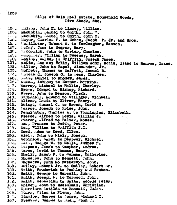 | 1839 Bills of Sale Real Estate, Household Goods, Live Stock, etc. 122. Luizoy, John H. to Linzey, William. 123. Macubbin, Samuel to Smith, John W. 124. Macubbin, Samuel to Smith, John W. 125. Mayer, Charles F. to Cohen, Jacob P. Jr. and Bros. 126. McAllister, Robert A. to EarCougher, Hanson. 127. McCay, Jans to Weaver, Mary. 128. McCormick, John to Carter, Charles. 129. McCulley, William to Sweeney, Sarah. 130. Moxley, Walter to Griffith, Joseph Janes. 131. McKim, Ann and McKim, William Admr. McKim, Isaac to Munroe, Isaac. 132. Miller, John to Rapel, Alexander, Jr. 133. Moffett, Thomas to Moffett, Sammuel D. 134. Moreland, Joseph G. to Leas, Charles. 135. Matt, Daniel to Rhodes, James. 136. Munch, Anthony to Herman. Fortine. 137. Murray, Michael to Hollis, Charley. 138. Myers, Edward to Bishop, Richard. 139. Myers, John to Benson Elyah. 140. O'Donnell, Edward to Stillger, Michael 141. Oliver, Lewis to Oliver, Henry. 142. Owings, Samuel C. to Brown, David W. 143. Pearce, Joseph to Price, John. 144. Pennington, Charles A. to Pennington, Elizabeth. 145. Pierce, Alfred to Lewis, William J. 146. Pierce, Alfred to Palmer, Moses. 147. Rea, Frances to Smith, Peter. 148. Rea, William to Griffith J.I. 149. Reed, Adam to Reed, Ellen. 150. Riely, John to Riely, Joseph. 151. Robinson, Sarah to Dempsey, Michael. 152. Rush, George W. to Wells, Andrew H. 153. Sampson, Jacob to Campher, Andrew. 154. Serew, David to Thomas, Henry. l55. Shelly, Jacob F. to Herman, Catherine. 156. Showacre, John to Bennett, John. 157. Showacre, John to Patterson, John. 158. Smiley, Robert Jr. to Smiley, Robert Sr. 159. Smith, Frederick to Deahley and Fenton. 160. Smith, George to Marsell, John. 161. Smith, Joseph F. to Norwood, John. 162. Smith, Sebastian to Smith, George Peter. 163. Spicer, John to Musselman, Christian. 164. Spurrier, Matilda to Roswald, Judah. 165. Starr, Ellen to Flynn, John. 166. Staylor, George to Jones, Richard T. 167. Steever, George to Bush, John D. |