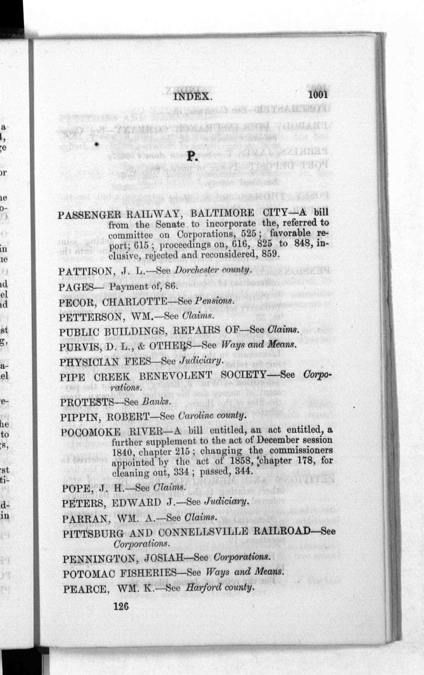 INDEX. 1001 P. PASSENGER RAILWAY, BALTIMORE CITY—A bill PATTISON, J. L.—See Dorchester county. PAGES— Payment of, 86. PECOR, CHARLOTTE—See Pensions. PETTERSON, WM.—See Claims. PUBLIC BUILDINGS, REPAIRS OF—See Claims. PURVIS, D. L., & OTHERS—See Ways and Means. PHYSICIAN FEES—See Judiciary. PIPE CREEK BENEVOLENT SOCIETY—See Corpo- PROTESTS—See Bank. PIPPIN, ROBERT—See Caroline county. POCOMOKE RIVER—A bill entitled, an act entitled, a POPE, J. H.—See Claims. PETERS, EDWARD J.—See Judiciary. PARRAN, WM. A.—See Claims. PITTSBURG AND CONNELLSVILLE RAILROAD—See Corporations. PENNINGTON, JOSIAH—See Corporations. |