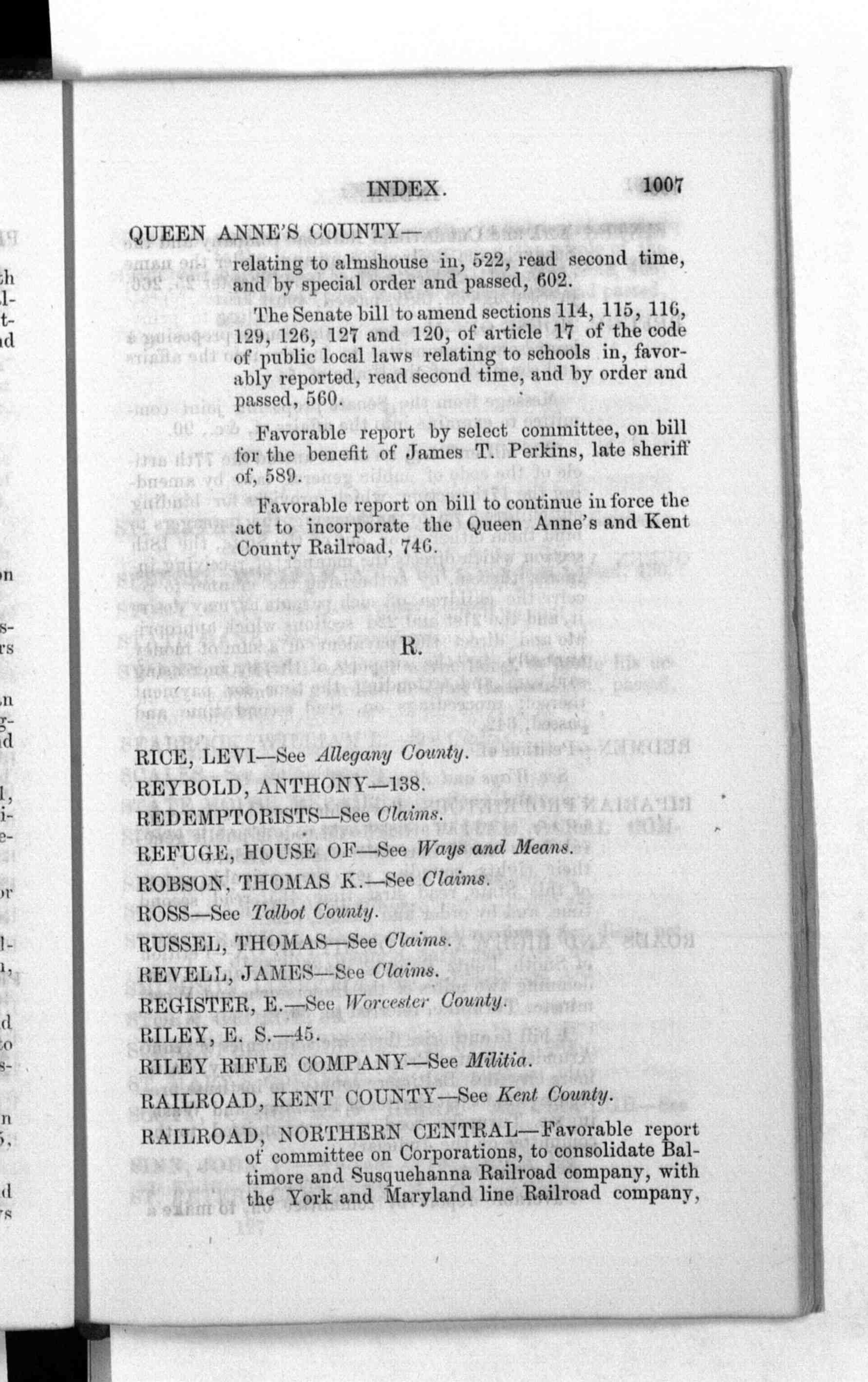 INDEX. 1007 QUEEN ANNE'S COUNTY— relating to almshouse in, 522, read second time, The Senate bill to amend sections 114, 115, 110, Favorable report by select committee, on bill Favorable report on bill to continue in force the R. RICE, LEVI—See Allegany County. REFUGE, HOUSE OF—See Ways and Means. ROBSON, THOMAS K.—See Claims. ROSS—See Talbot County. RUSSEL, THOMAS—See Claims. REVELL, JAMES—See Claims. REGISTER, E.—See Worcester County. RILEY, E. S.—45. RILEY RIFLE COMPANY—See Militia. RAILROAD, KENT COUNTY—See Kent County. RAILROAD, NORTHERN CENTRAL—Favorable report |