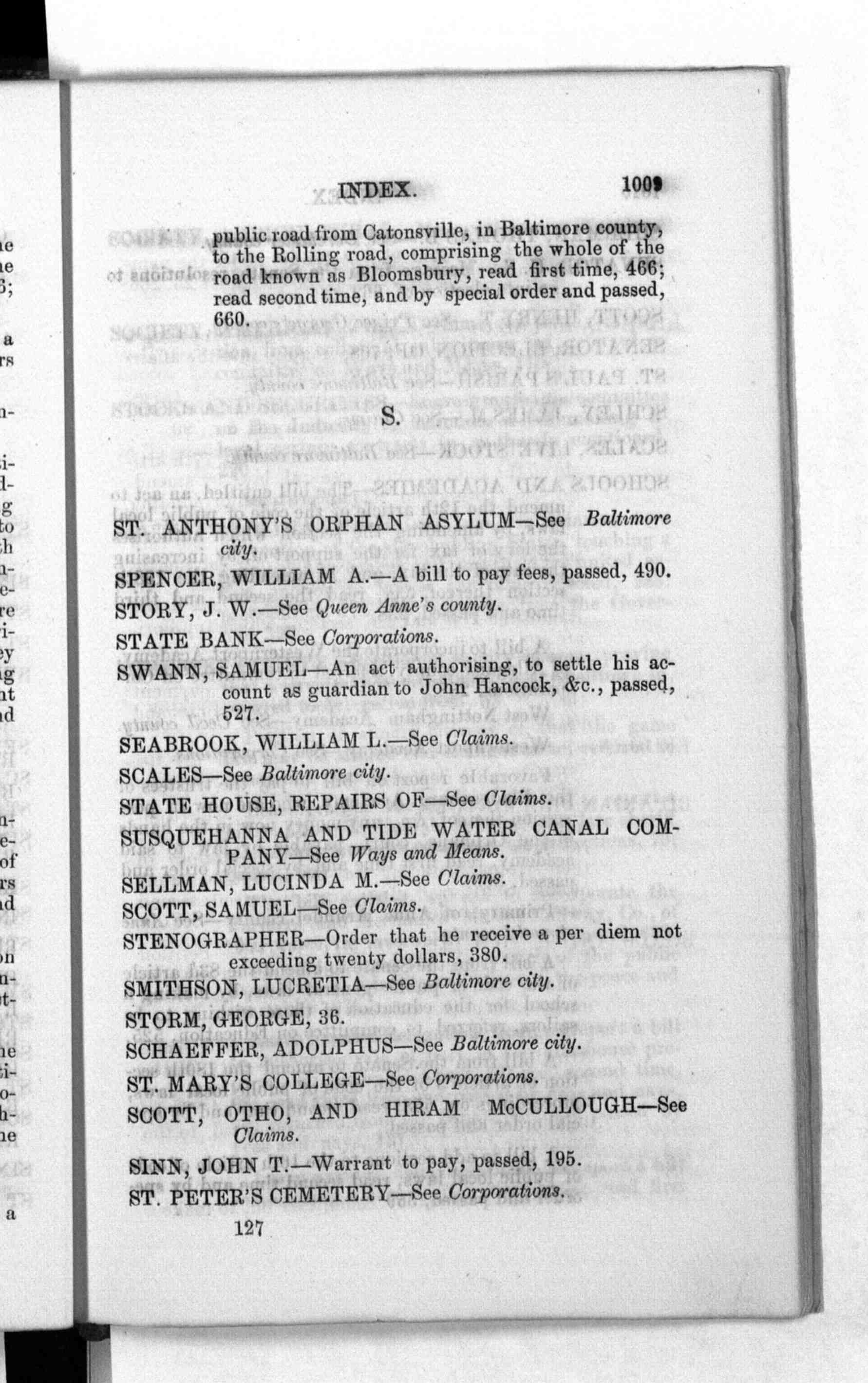 SEABROOK, WILLIAM L.—See Claims. SCALES—See Baltimore city. STATE HOUSE, REPAIRS OF—See Claims. SUSQUEHANNA AND TIDE WATER CANAL COM- STENOGRAPHER—Order that he receive a per diem not exceeding twenty dollars, 380. STORM, GEORGE, 36. SCHAEFFER, ADOLPHUS—See Baltimore city. ST. MARY'S COLLEGE—See Corporations. SCOTT, OTHO, AND HIRAM McCULLOUGH—See SINN, JOHN T.—Warrant to pay, passed, 195. |